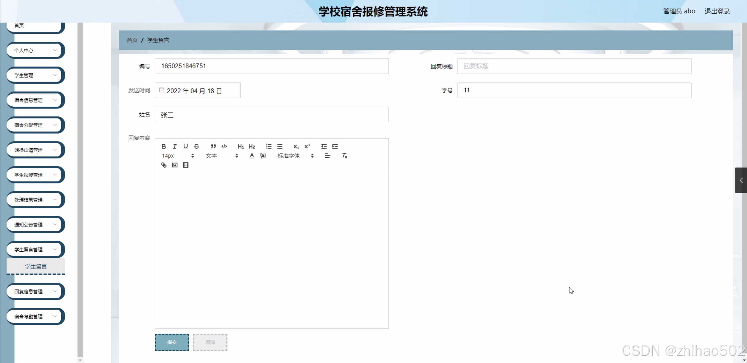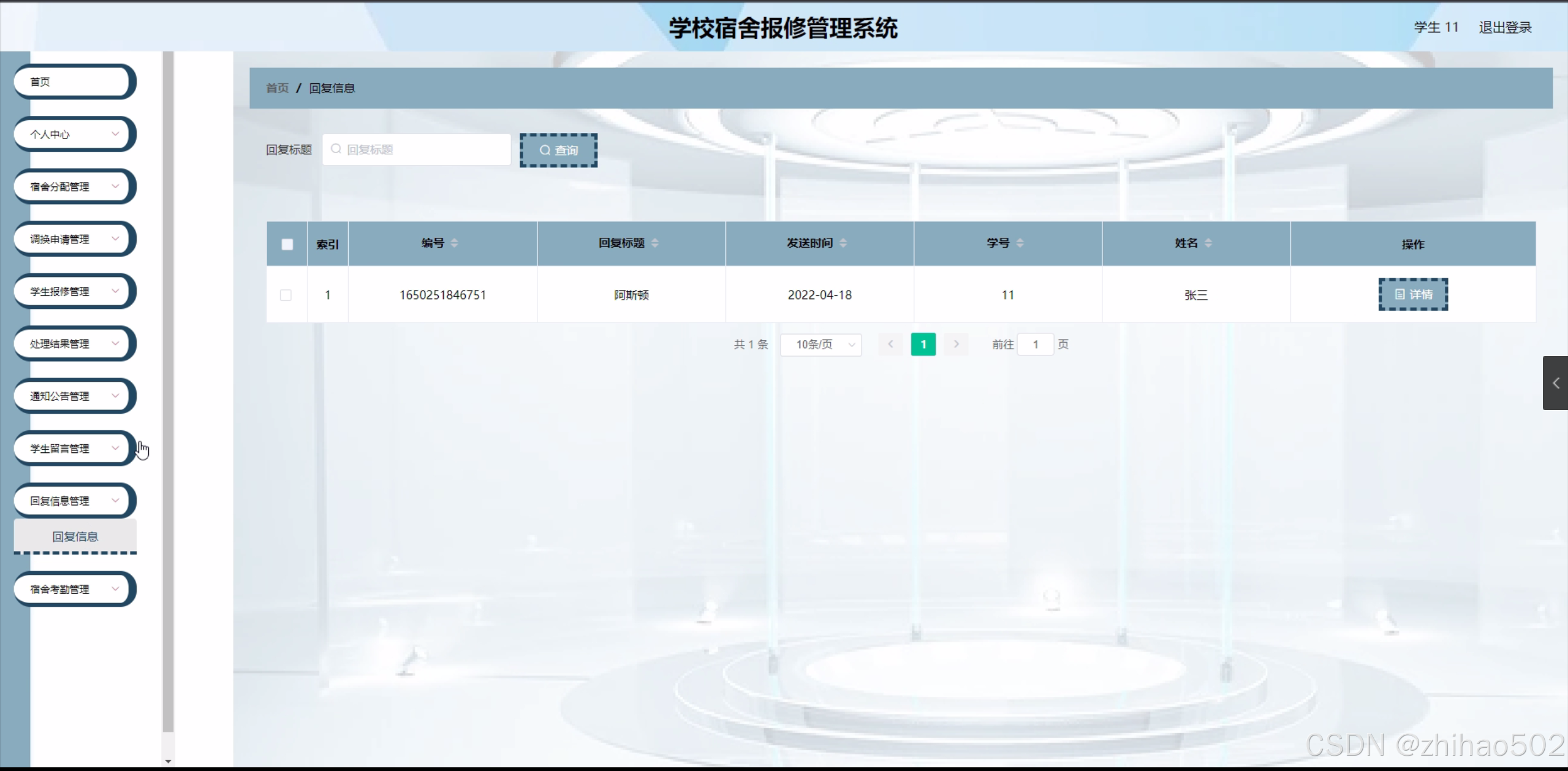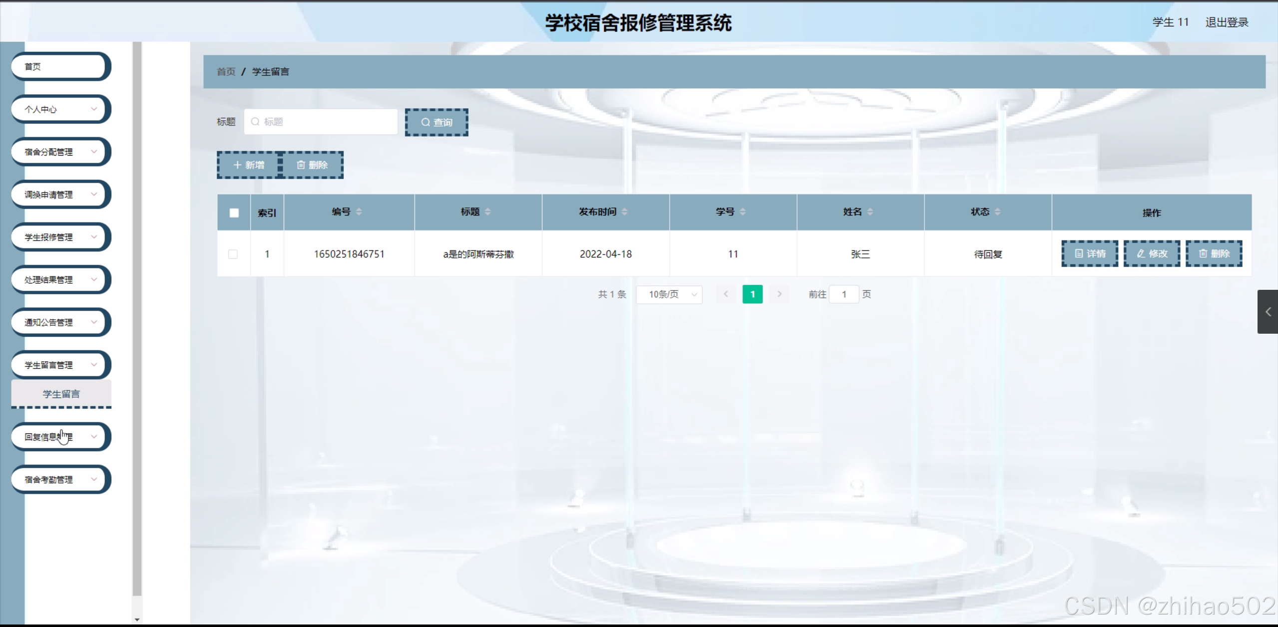 本研究将围绕学校宿舍报修管理系统的功能展开,具体包括:学生信息管理、宿舍分配与调换申请管理、学生报修管理、处理结果反馈、通知公告发布、学生留言与回复管理、宿舍信息管理以及宿舍考勤管理等。通过实现这些功能,构建一个集报修申请、处理、反馈于一体的综合性管理系统,提高宿舍报修管理的效率和透明度。同时,本研究还将关注系统的易用性和可扩展性,确保系统能够适应未来高校后勤管理的需求变化。