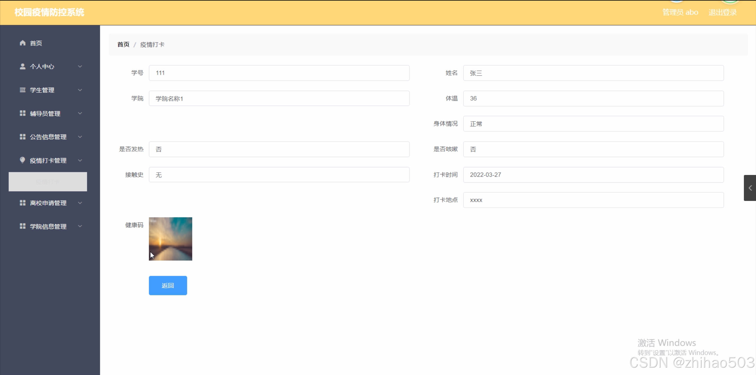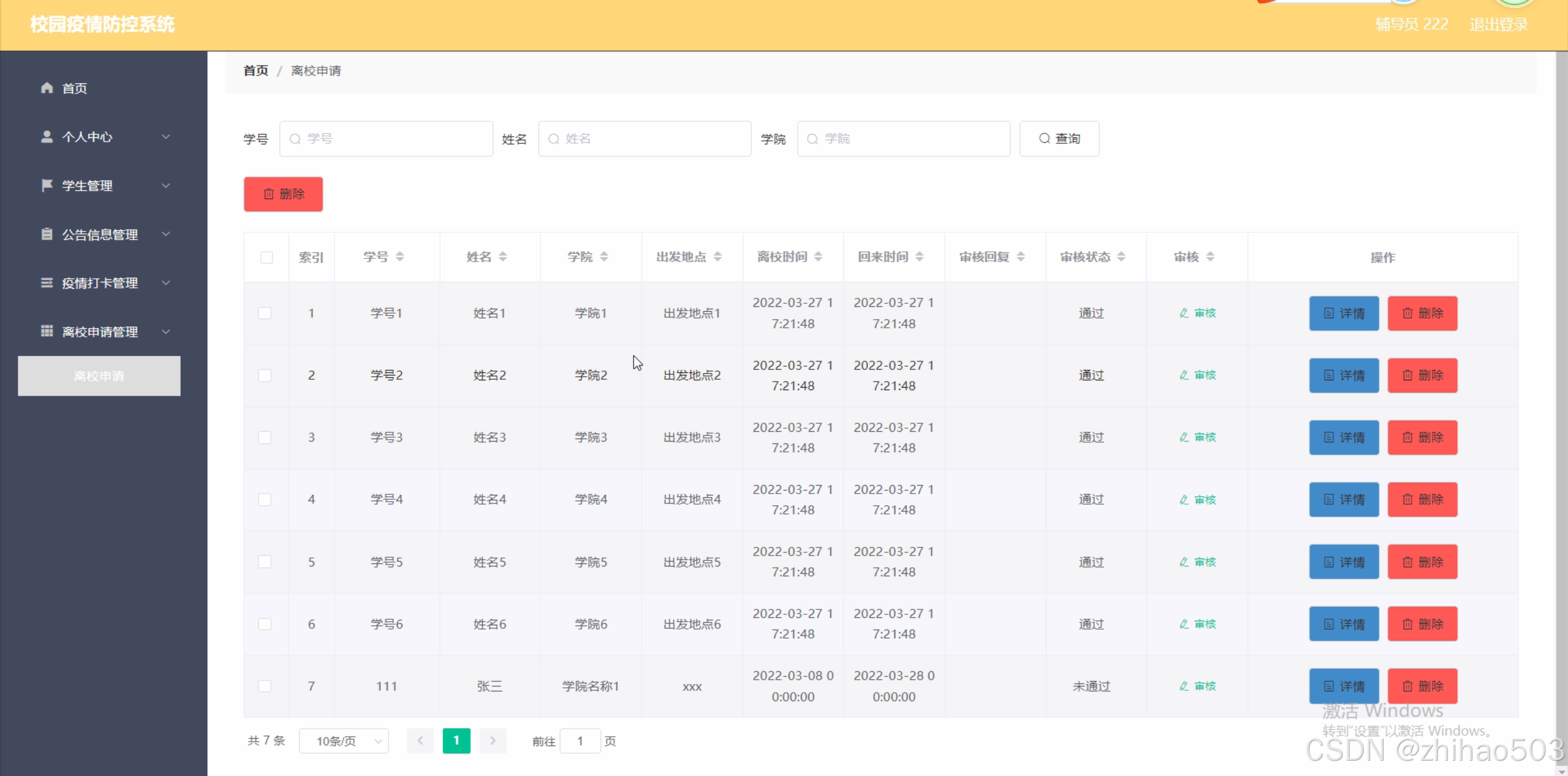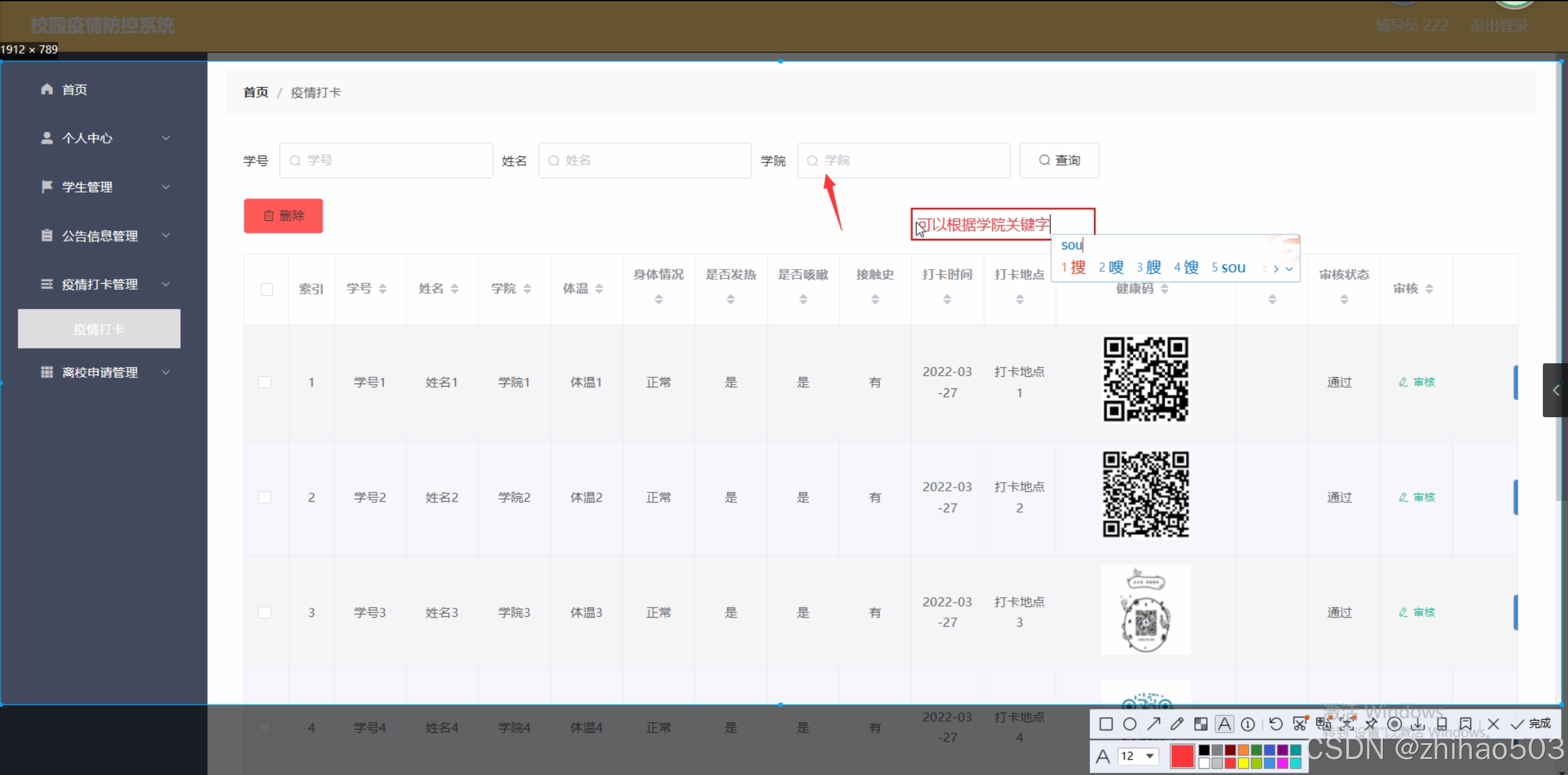 本研究将围绕校园疫情防控系统的功能展开,具体包括学生信息管理、辅导员管理、公告信息发布、疫情打卡记录、离校申请审批、学院信息管理等功能模块。通过深入分析这些功能模块的设计和实现,探讨其在校园疫情防控中的应用效果和存在问题,提出针对性的改进建议,以期构建一个更加完善、高效、便捷的校园疫情防控系统。