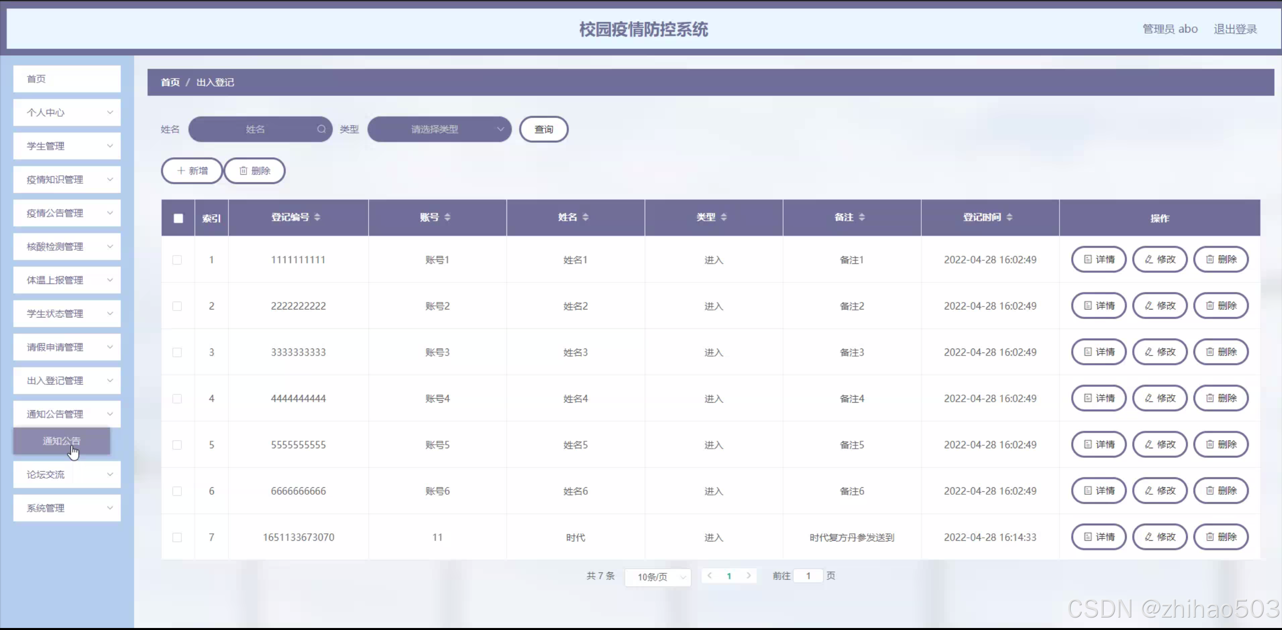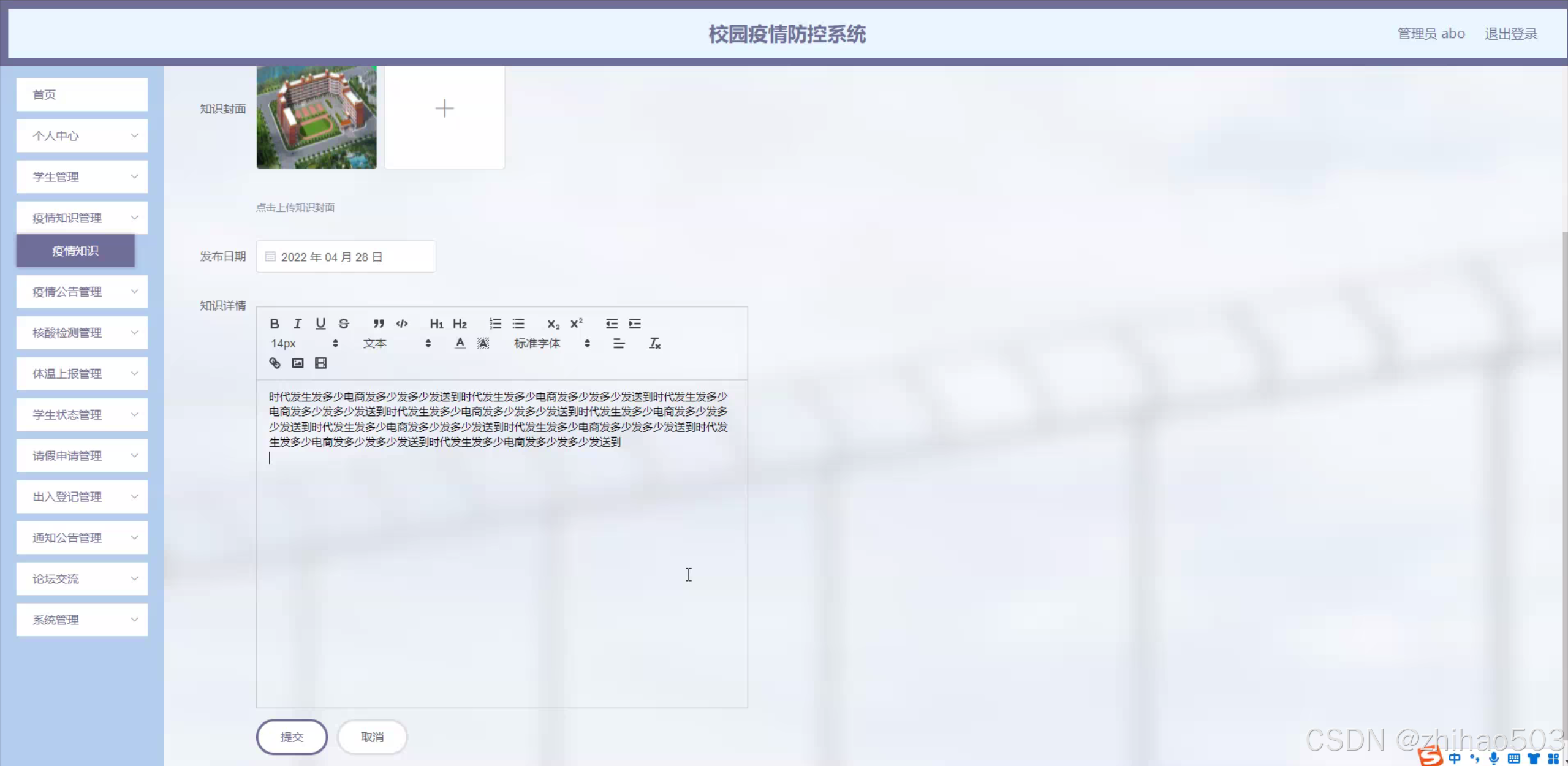 随着全球新冠疫情的持续蔓延,校园疫情防控成为各大教育机构面临的重要挑战。现有研究主要集中在宏观层面的疫情防控策略及效果评估,而专门针对校园这一特殊场景的疫情防控系统研究较少。校园作为人员密集、流动性大的场所,其疫情防控具有独特性和复杂性。因此,本选题将以校园疫情防控系统为研究情景,重点分析和研究如何通过信息化手段实现校园疫情的精准防控,以期探寻校园疫情传播的原因及防控机制,提出有效的对策建议,为后续更加深入的研究提供基础。