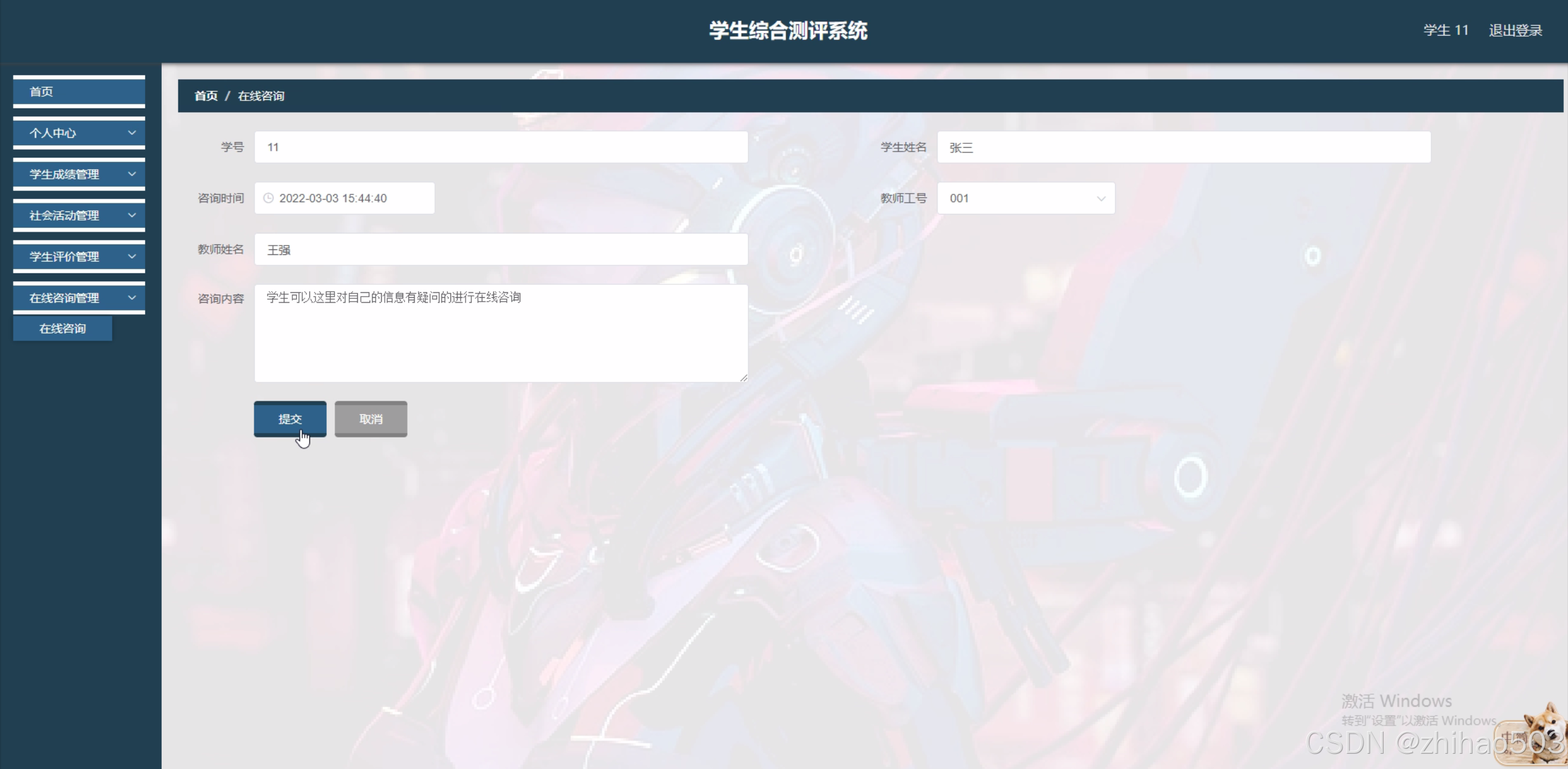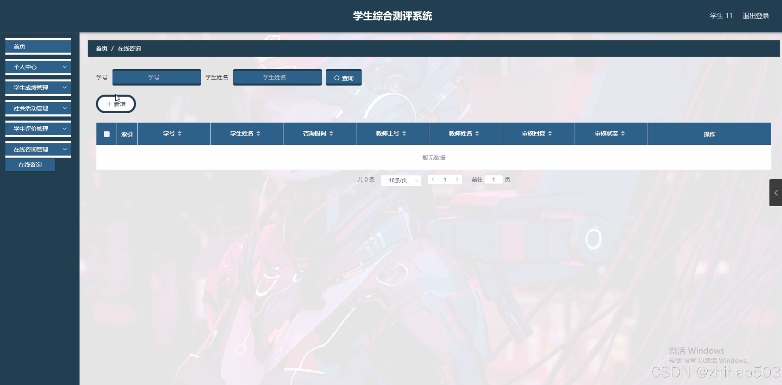 本研究将围绕学生综合测评系统的构建展开,具体研究内容包括:学生信息管理模块的设计和实现,用于存储和查询学生的基本信息;学生成绩管理模块,用于记录和分析学生的学习成绩;社会活动管理模块,用于记录学生的社会实践和志愿服务活动;学生评价模块,实现学生互评和教师评价功能;以及在线咨询模块,为学生提供便捷的在线咨询服务。通过这五个核心功能模块的设计和实现,构建一个功能全面、操作便捷、用户友好的学生综合测评系统。