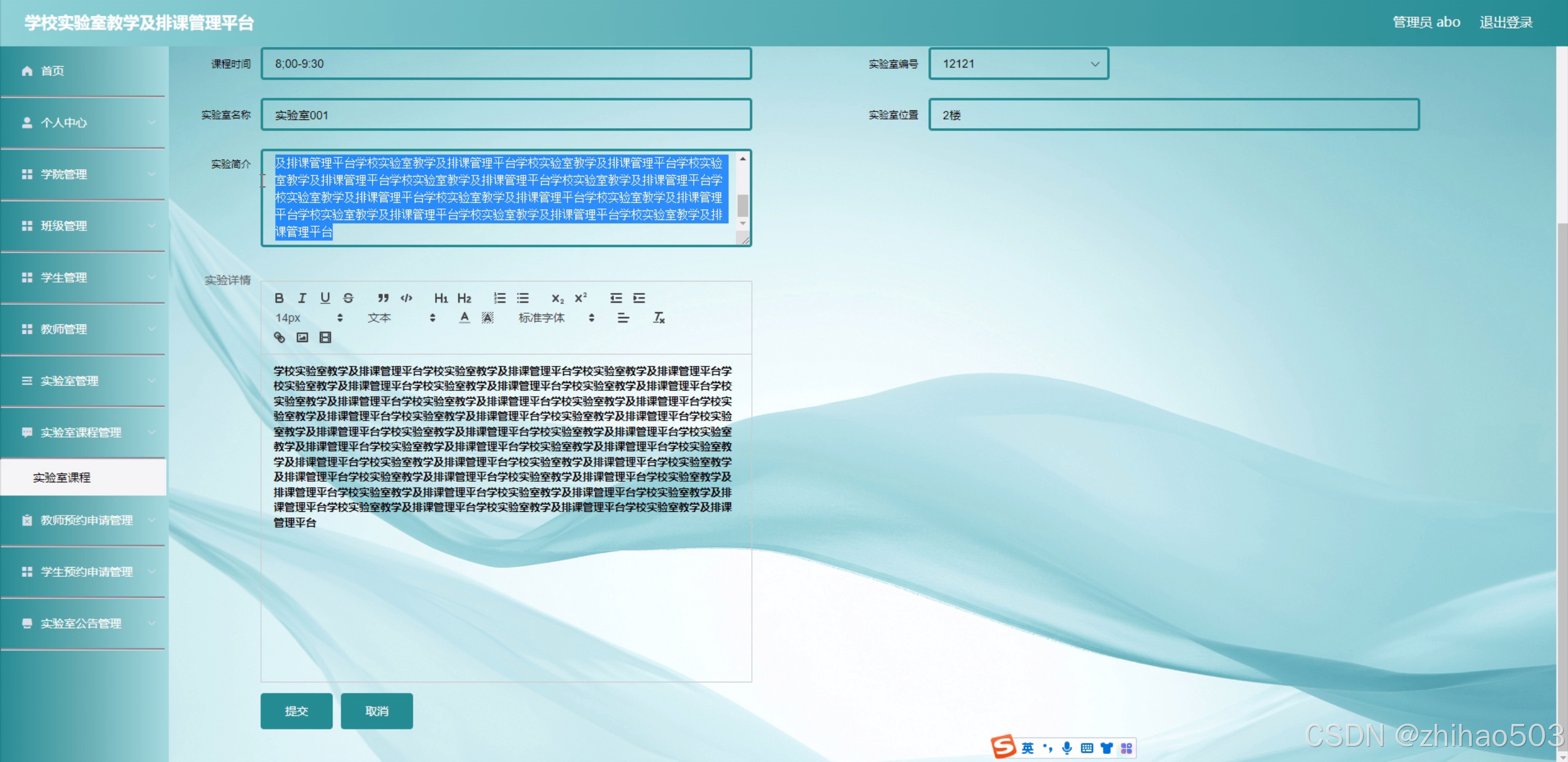 本研究将围绕学校实验室教学及排课管理平台进行系统设计和开发。平台将涵盖学生、学院、班级、教师、实验室、实验室课程等多个功能模块。其中,学生模块将提供课程查询、实验室预约、公告查看等功能;学院和班级模块将用于管理学生和课程信息;教师模块将支持教师发布课程信息、查看学生预约情况、提交实验室预约申请等功能;实验室模块将展示实验室资源信息和使用情况;实验室课程模块将实现课程安排和排课管理功能。此外,平台还将提供教师预约申请和学生预约申请的审批流程管理,以及实验室公告的发布和查看功能。通过这些功能模块的整合和优化,旨在构建一个高效、便捷、安全的实验室教学与排课管理平台。
