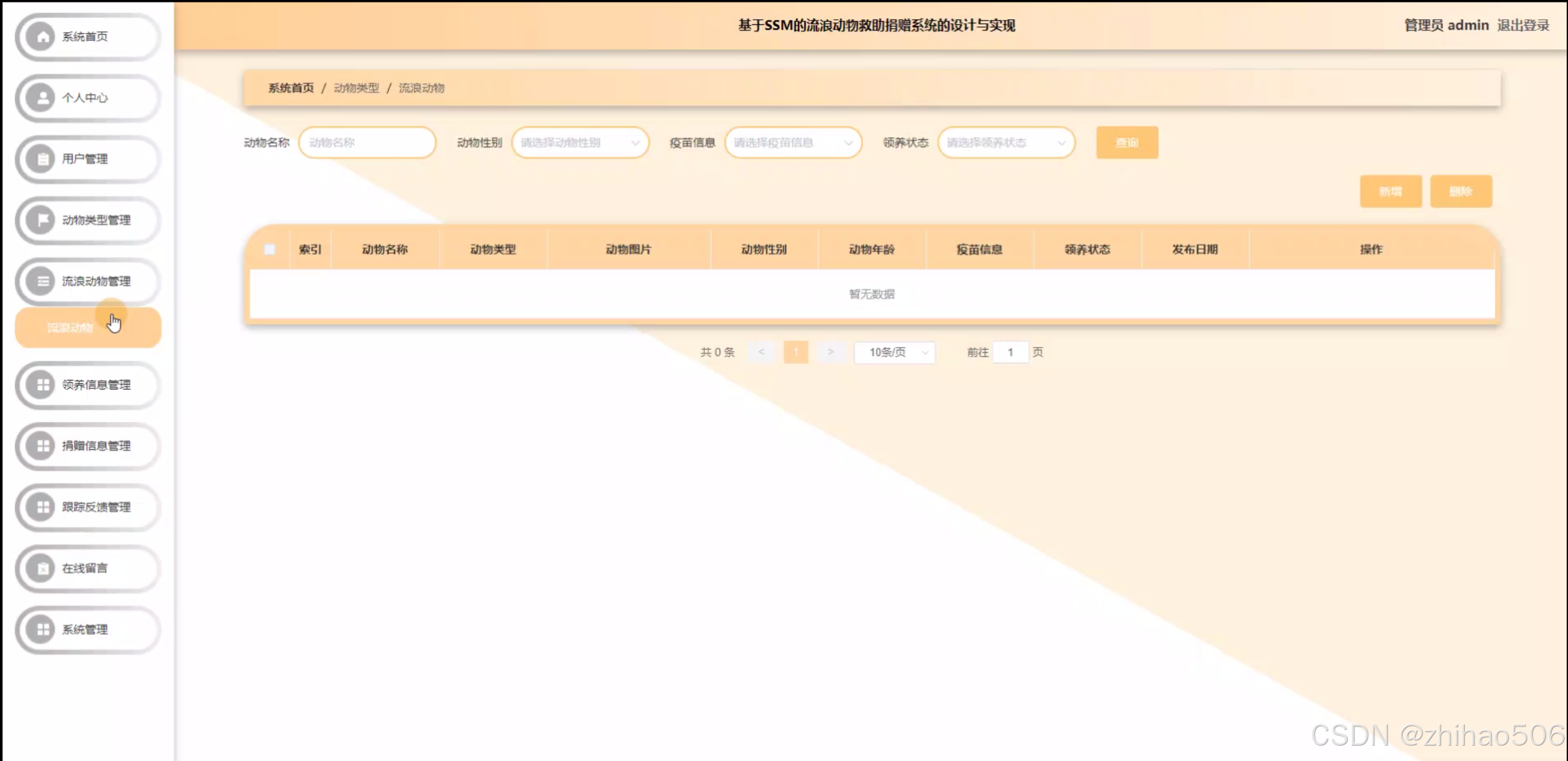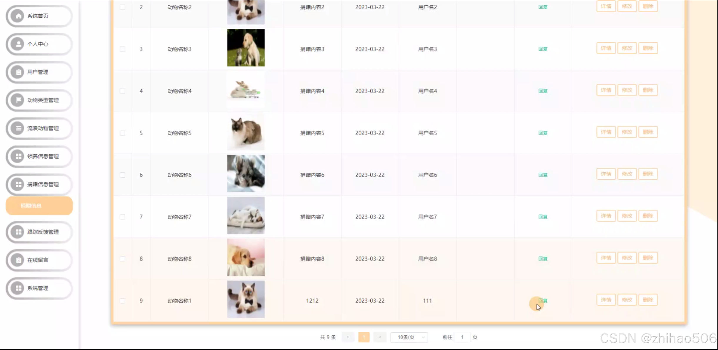 本研究将围绕流浪动物救助捐赠系统的功能需求,详细设计和实现以下系统功能模块:用户管理模块,用于注册、登录和权限管理;动物类型管理模块,用于分类展示不同种类的流浪动物;流浪动物信息管理模块,用于展示流浪动物的基本信息和救助状态;领养信息发布模块,用于发布领养信息和匹配合适的领养者;捐赠信息管理模块,用于记录捐赠信息和捐赠者的捐赠历史;跟踪反馈模块,用于跟踪救助进度并收集用户反馈。通过这些功能模块的设计和实现,构建一个功能完善、用户体验良好的流浪动物救助捐赠系统。