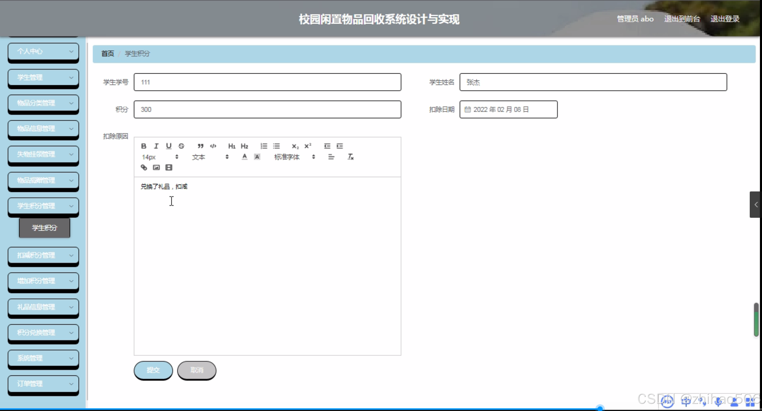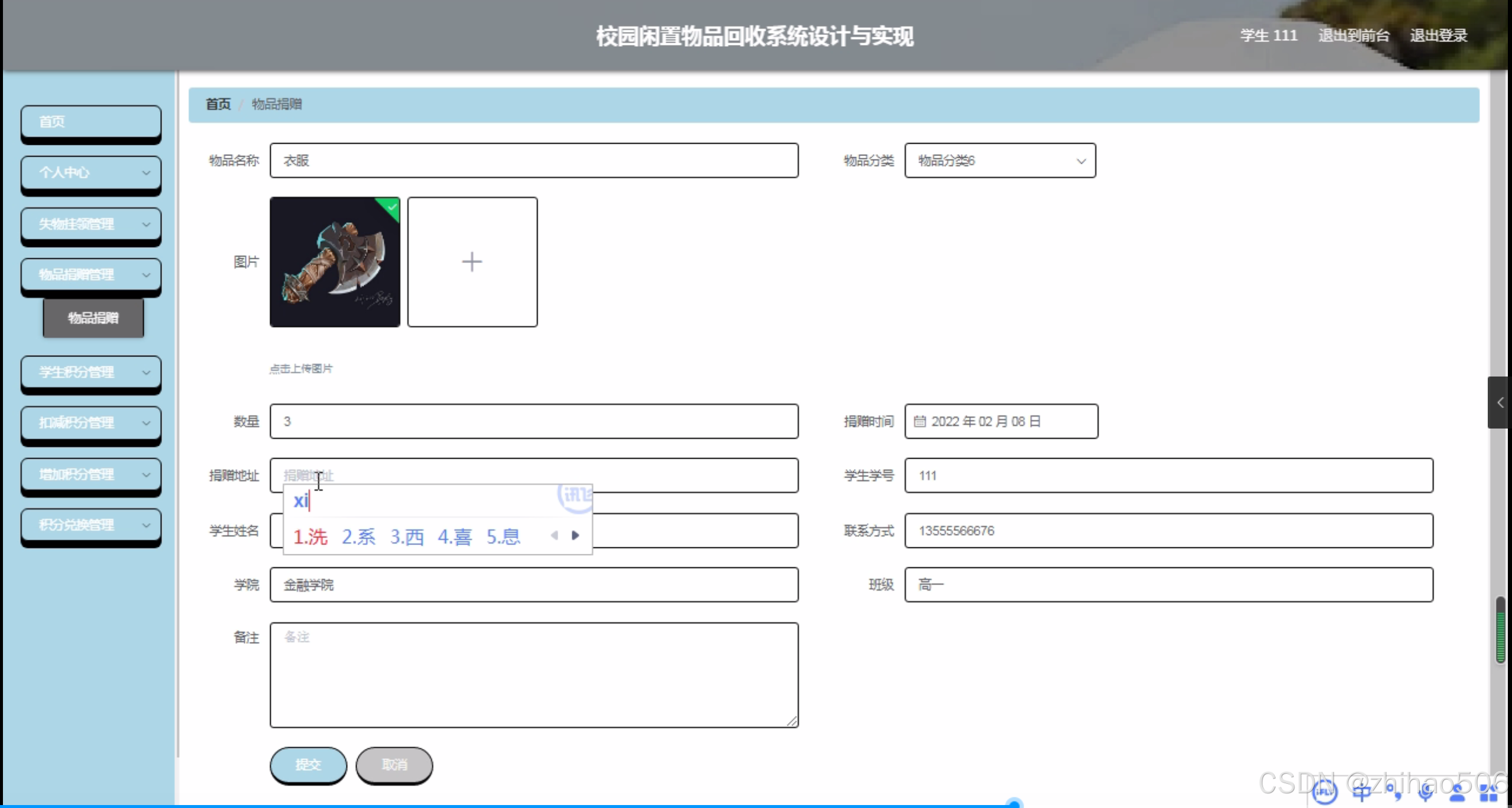 本研究将围绕校园闲置物品回收系统的设计与实现展开,具体研究内容包括:系统功能模块的设计,如学生信息管理、物品分类与信息管理、失物招领、物品捐赠、学生积分管理(包括扣减积分和增加积分)、礼品信息管理以及积分兑换等;系统数据库的设计,确保数据的完整性和安全性;系统界面的设计,提高用户体验;系统的实现与测试,确保系统的稳定性和可靠性。通过这些研究内容的深入探索,我们将实现一个功能完善、操作简便、用户体验良好的校园闲置物品回收系统。
