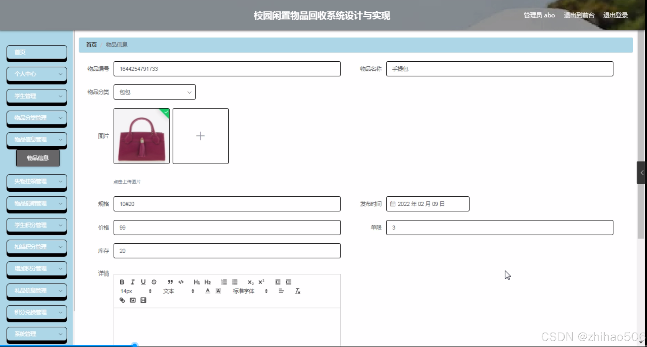 随着高校规模的扩大和学生消费能力的提升,校园内产生了大量的闲置物品,这些物品不仅占用空间资源,还可能对环境造成负担。关于校园闲置物品回收问题的研究,现有研究主要以城市垃圾分类和社区回收体系为主,专门针对校园闲置物品回收系统的研究较少。因此,本选题将以校园为研究情景,重点分析和研究如何通过设计并实现一个校园闲置物品回收系统,来有效提升校园资源的循环利用,减少浪费,同时培养学生的环保意识。通过这一研究,我们期望探寻校园闲置物品回收效率低下的原因,提出对策建议,为后续更加深入的研究提供基础。