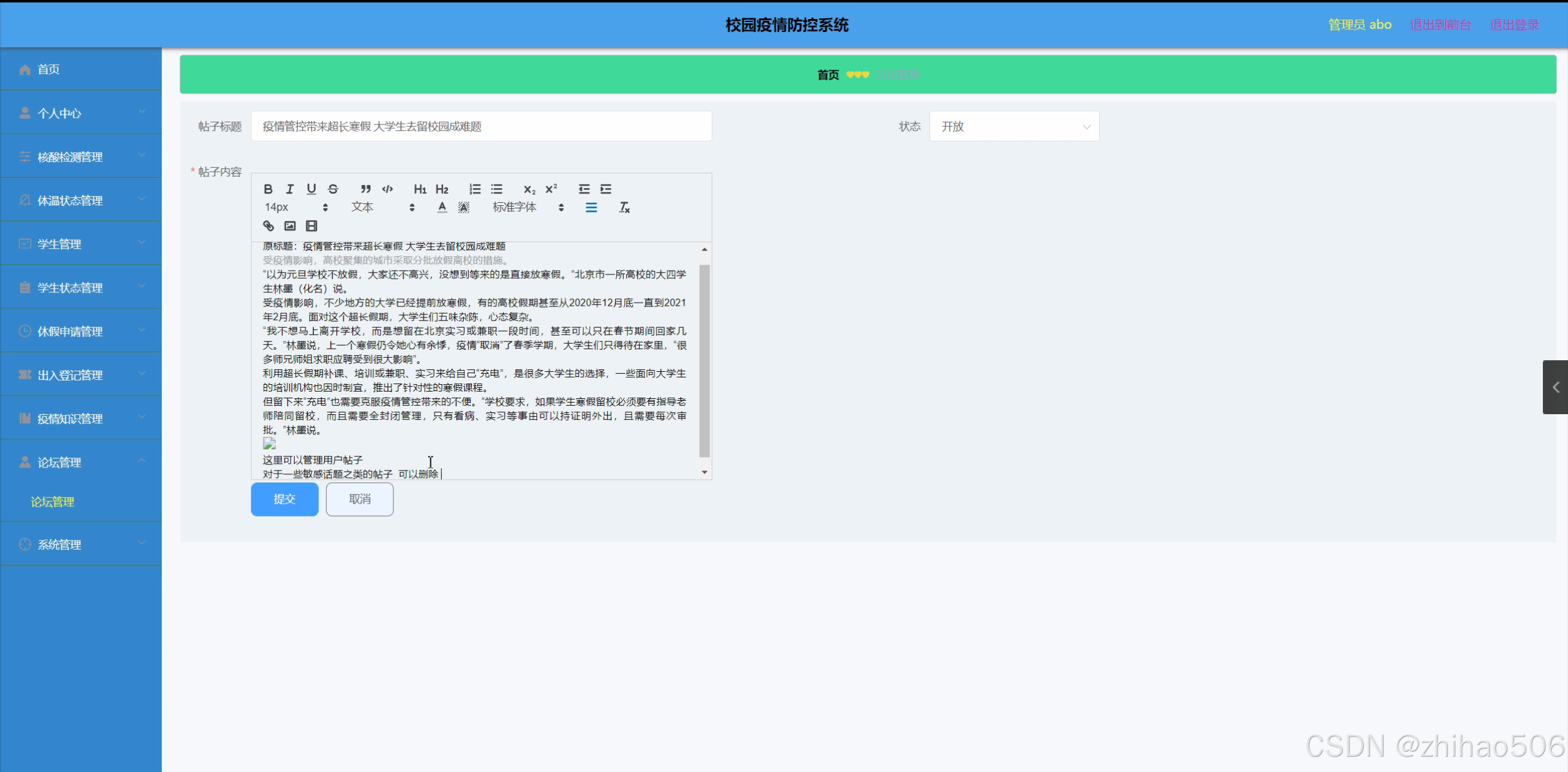 拟解决的主要问题包括:如何构建一个集学生信息管理、健康状态监控、核酸检测管理、体温状态监测、休假申请审批、出入登记管理和疫情知识普及于一体的校园疫情防控系统;如何通过该系统有效提升校园疫情防控的效率和准确性;以及如何确保系统数据的安全性和隐私保护。