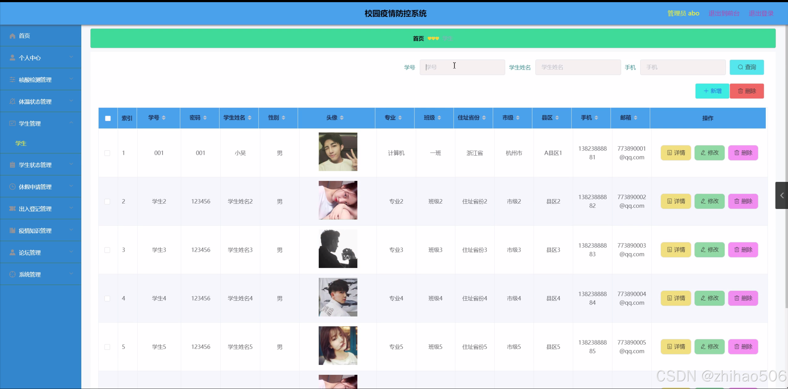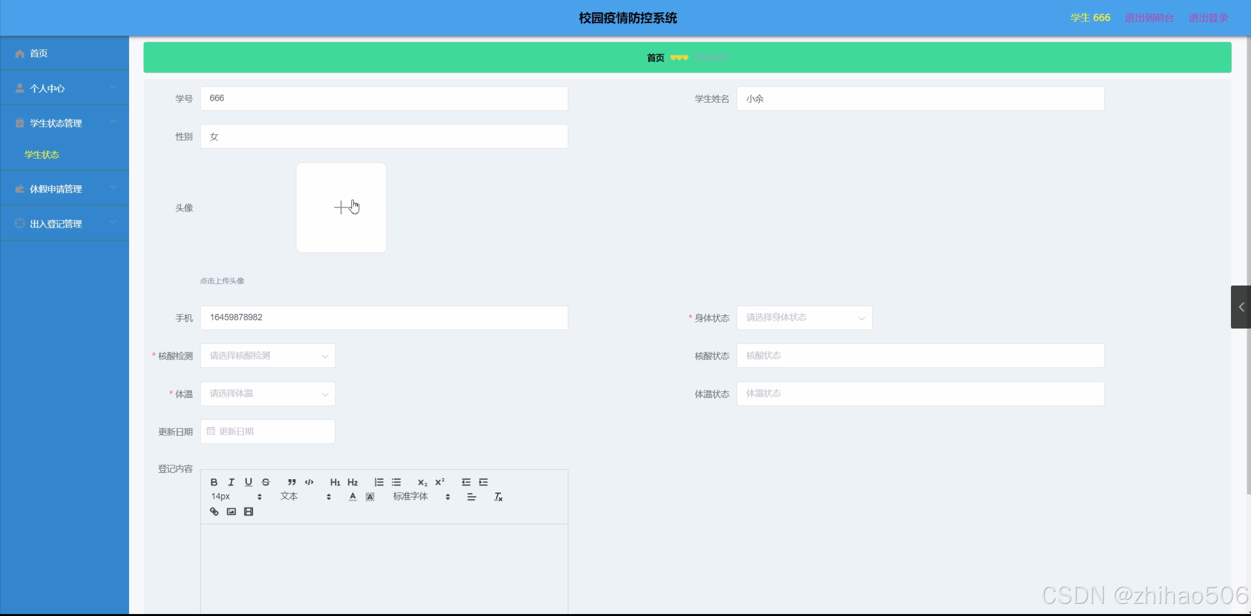 - 学生状态监控:实时更新学生的健康状态,包括核酸检测结果、体温数据等,实现异常状态的及时预警。