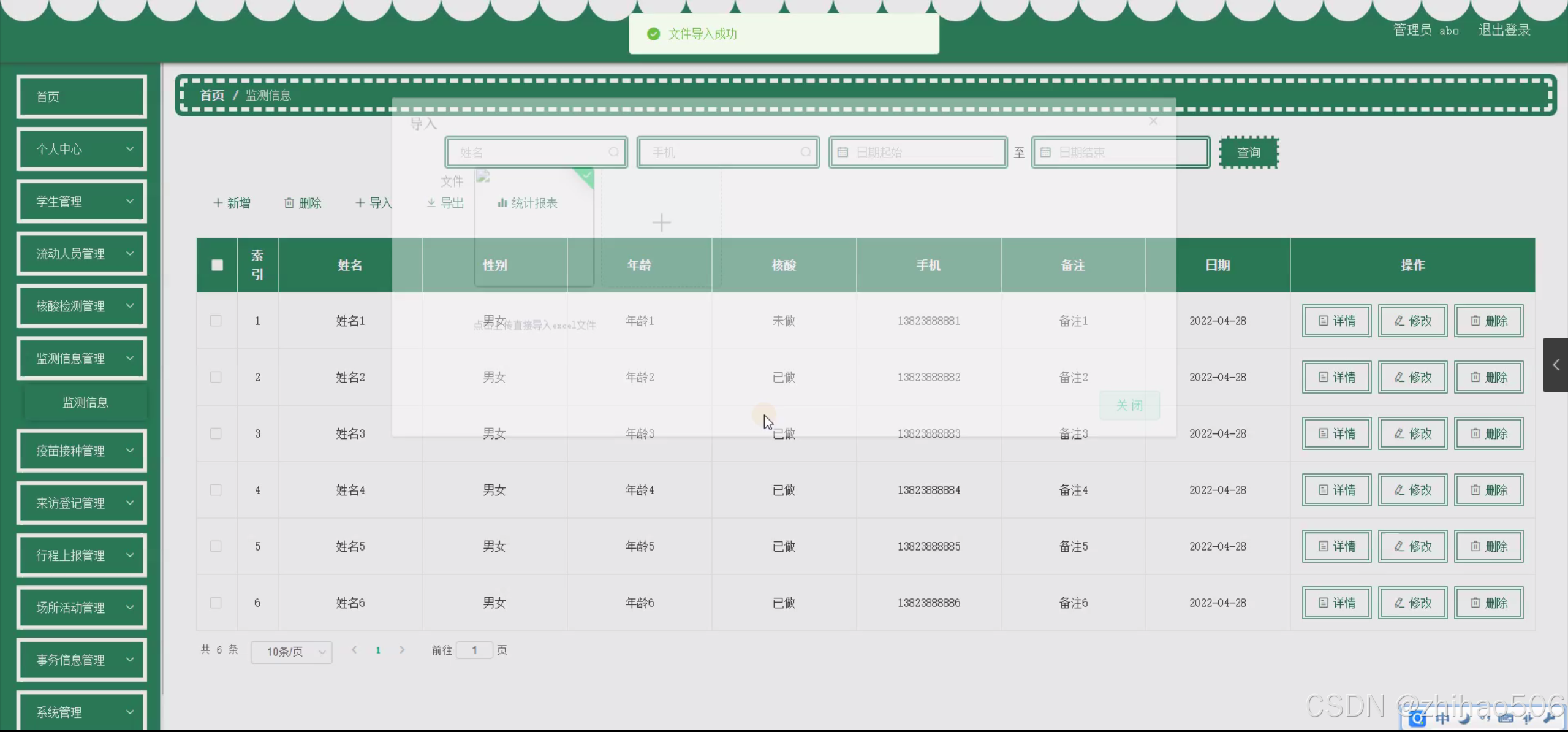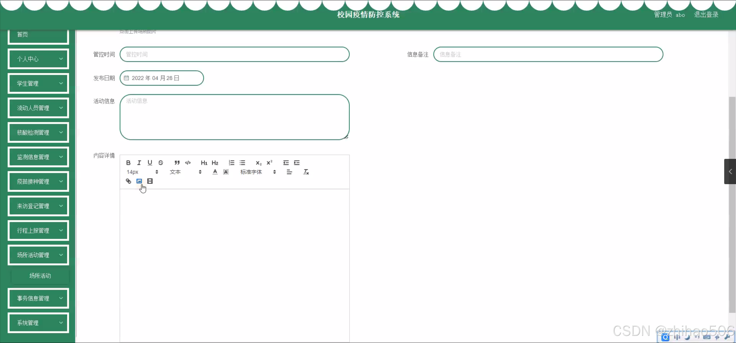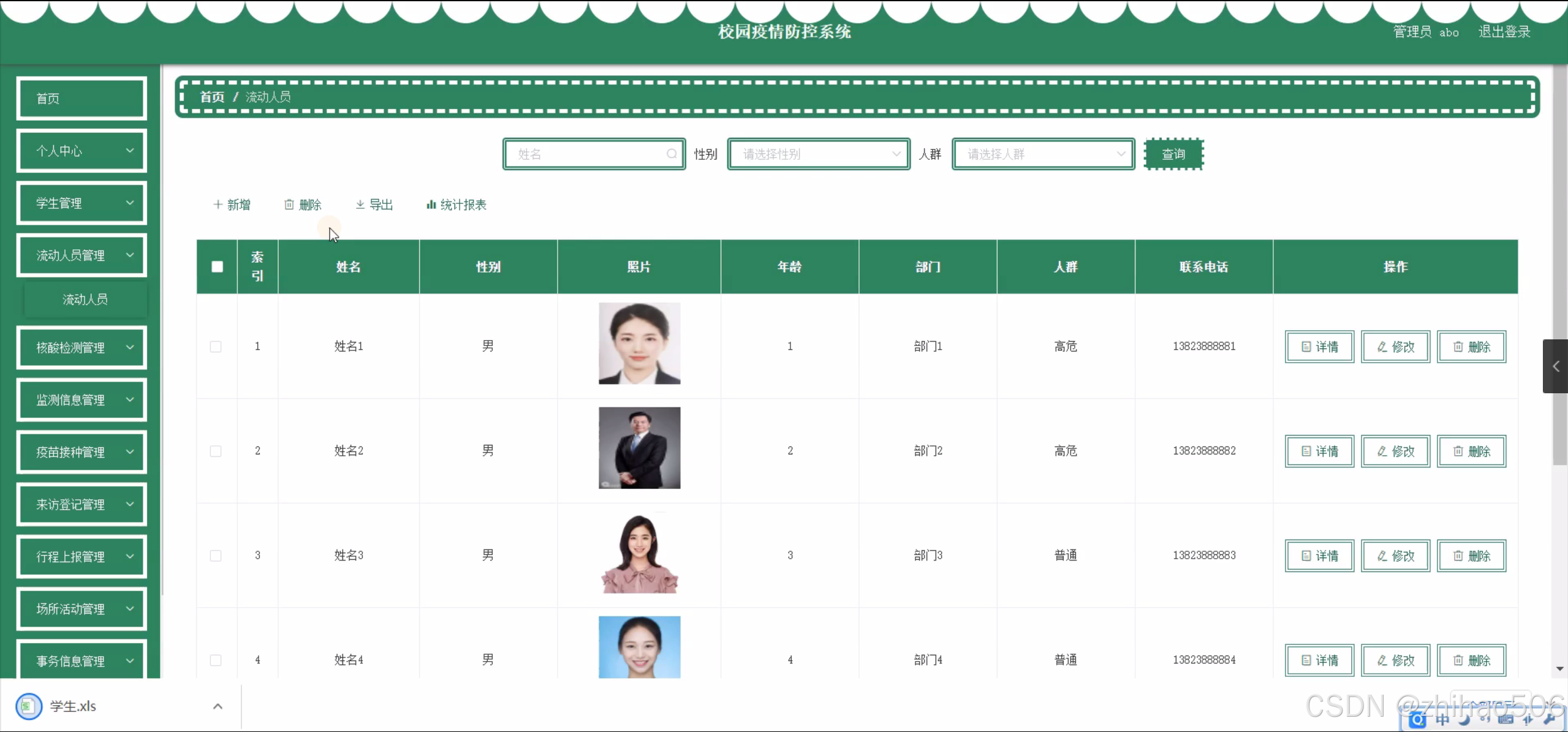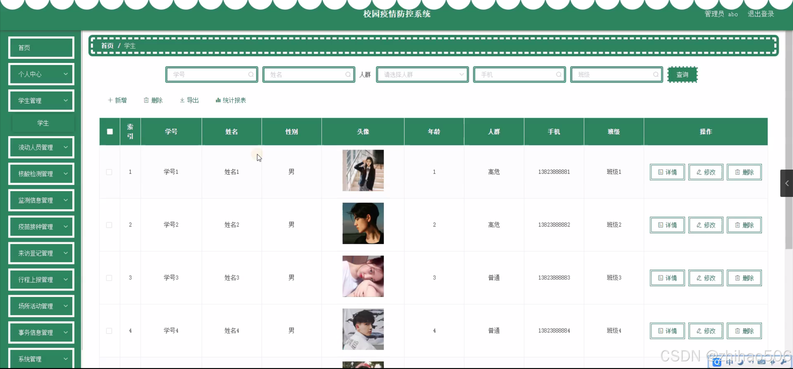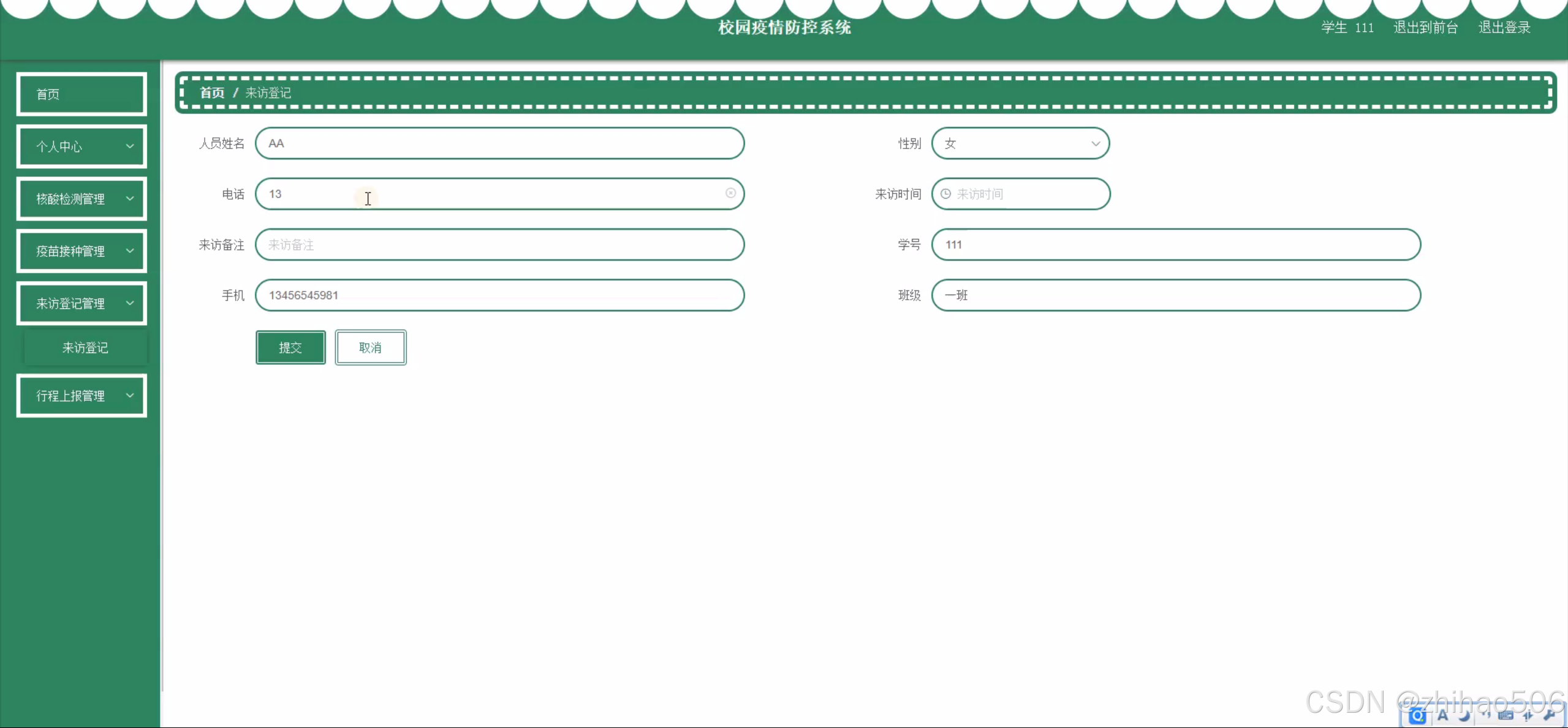本研究内容将围绕校园疫情防控系统的核心功能展开,具体包括:学生及流动人员的健康监测信息管理、来访登记与行程上报功能、疫苗接种记录跟踪、场所活动管控与预约系统、事务信息通知与反馈机制、以及核酸检测结果的实时更新与查询等。通过这些功能的综合应用,实现校园疫情防控的智能化、精准化和高效化。