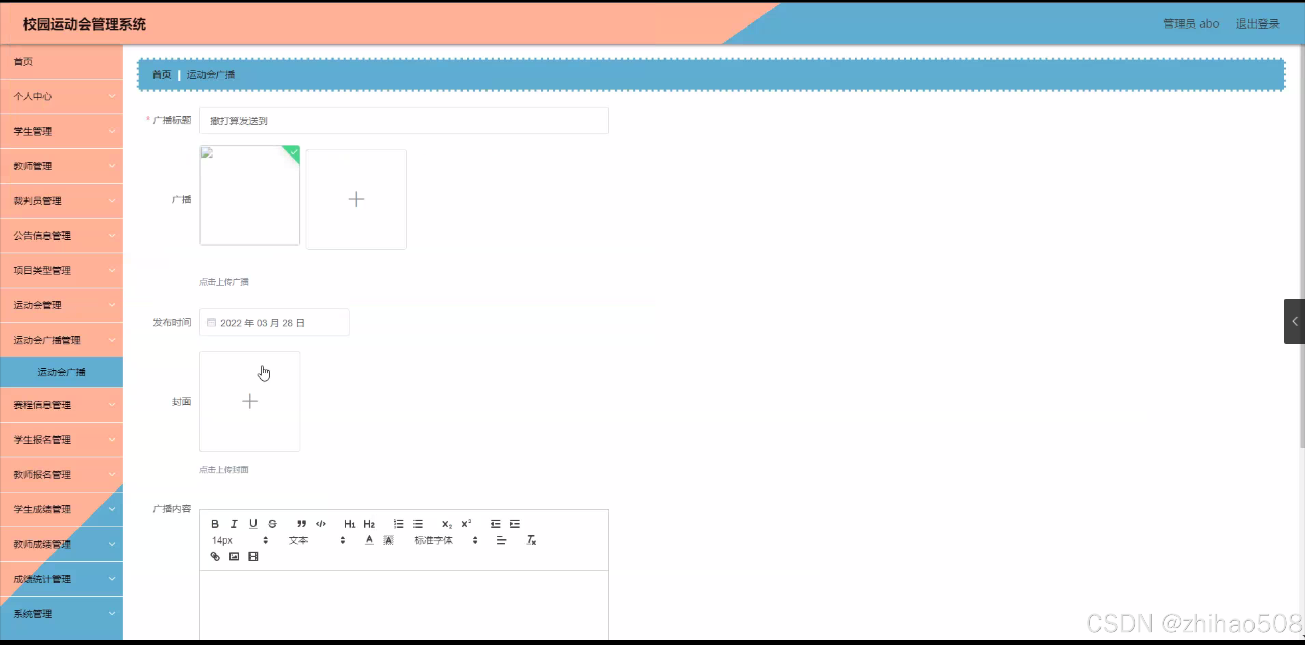 本研究将围绕校园运动会管理系统的功能需求展开,具体研究内容包括:公告信息的发布与管理、运动会报名系统的设计与实现、运动会广播系统的集成、项目类型的设置与管理、学生与教师报名信息的处理、裁判员的管理与分配、学生与教师成绩的管理与统计、赛程信息的展示与更新、成绩统计与分析等。通过系统的设计与开发,实现运动会管理的信息化和智能化,提升管理效率和服务水平。