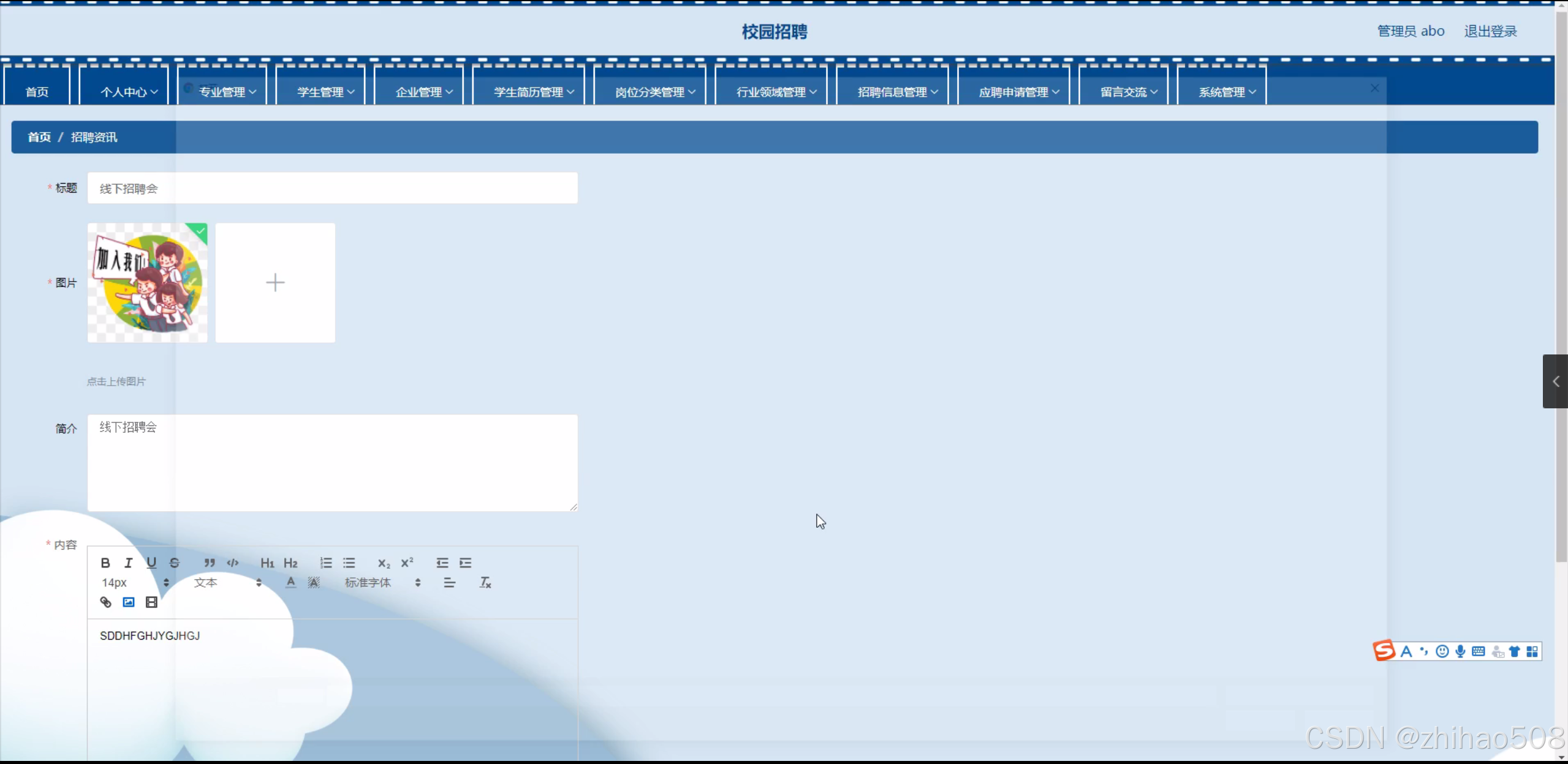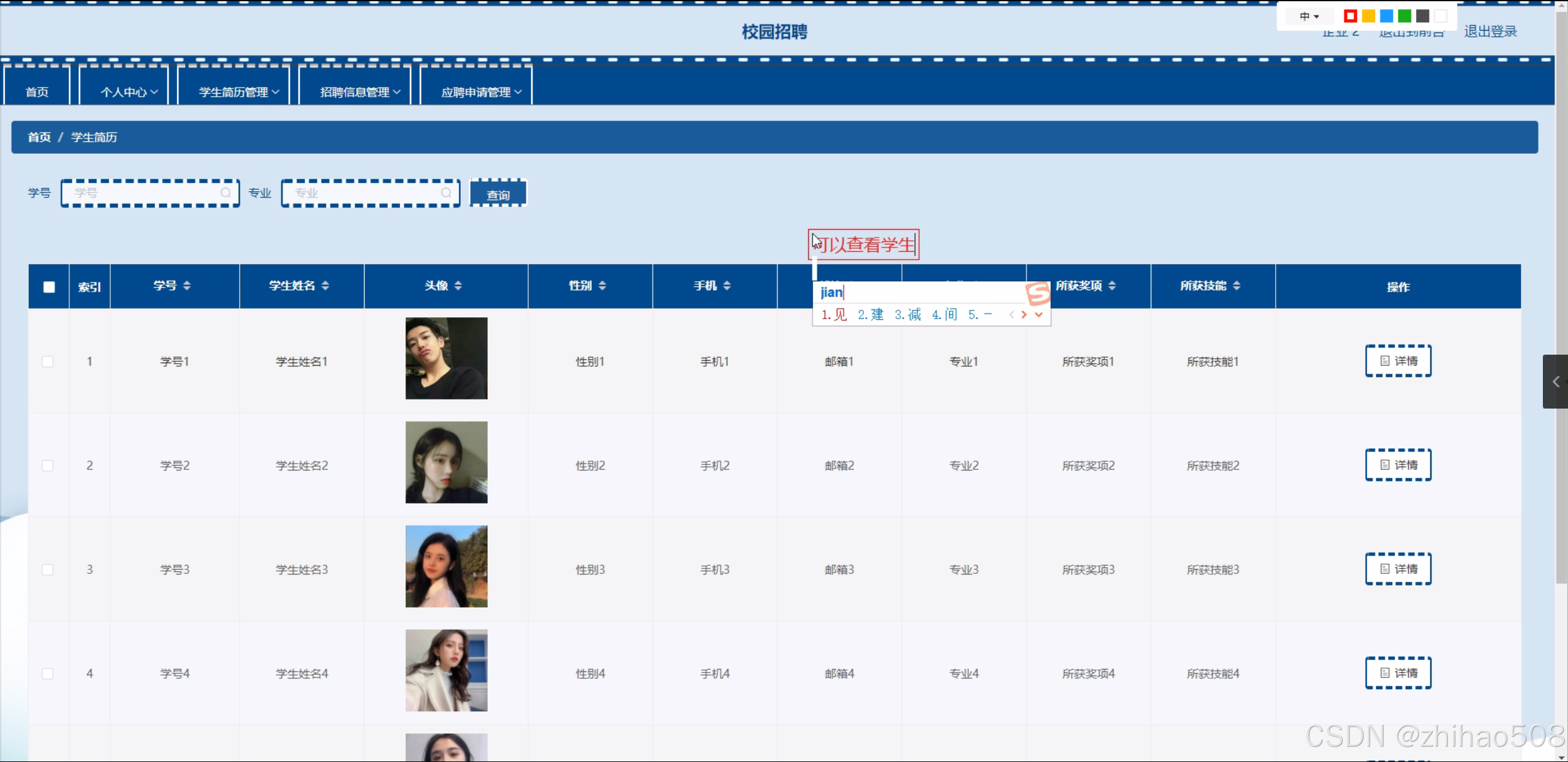 本研究将围绕校园招聘系统的核心功能展开,具体包括:专业匹配功能,根据学生所学专业与岗位需求进行智能匹配;学生信息管理功能,记录学生基本信息、求职意向及简历内容;企业信息管理功能,收集并展示企业基本信息、招聘需求及岗位详情;学生简历管理功能,支持学生在线编辑、投递简历;岗位分类与行业领域管理功能,对招聘岗位进行科学分类,并按行业领域进行划分;招聘信息发布与应聘申请管理功能,实现招聘信息的及时发布与学生应聘申请的在线处理。通过优化这些功能模块,旨在构建一个高效、便捷、智能的校园招聘系统。