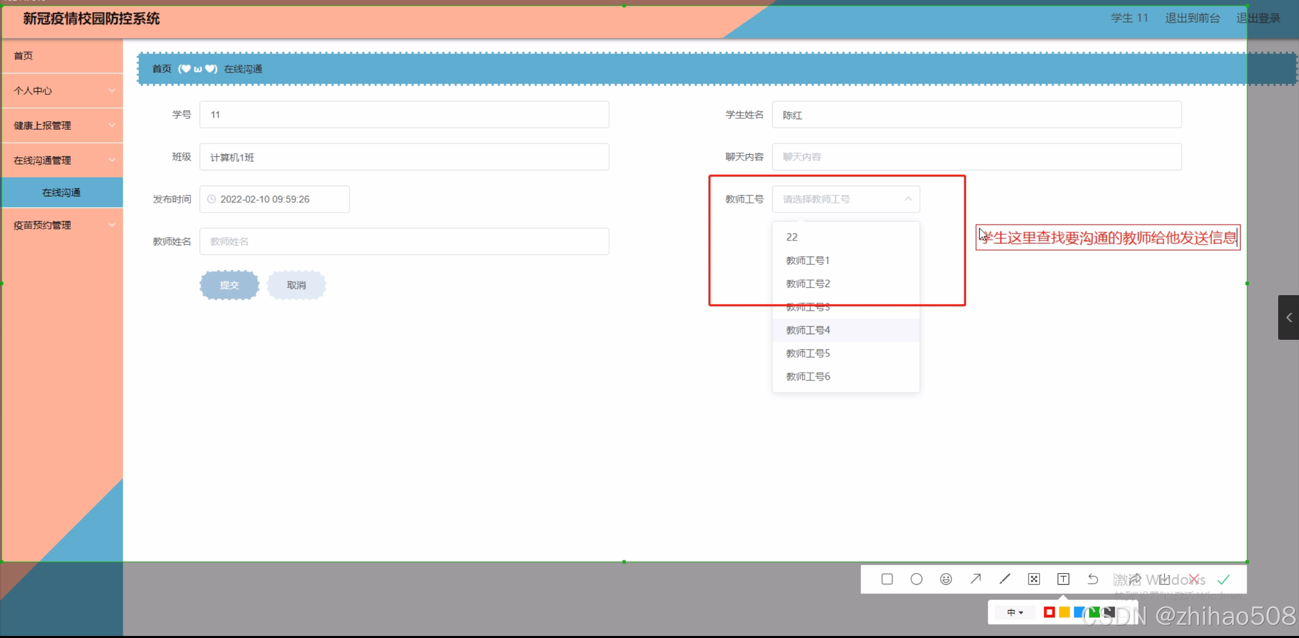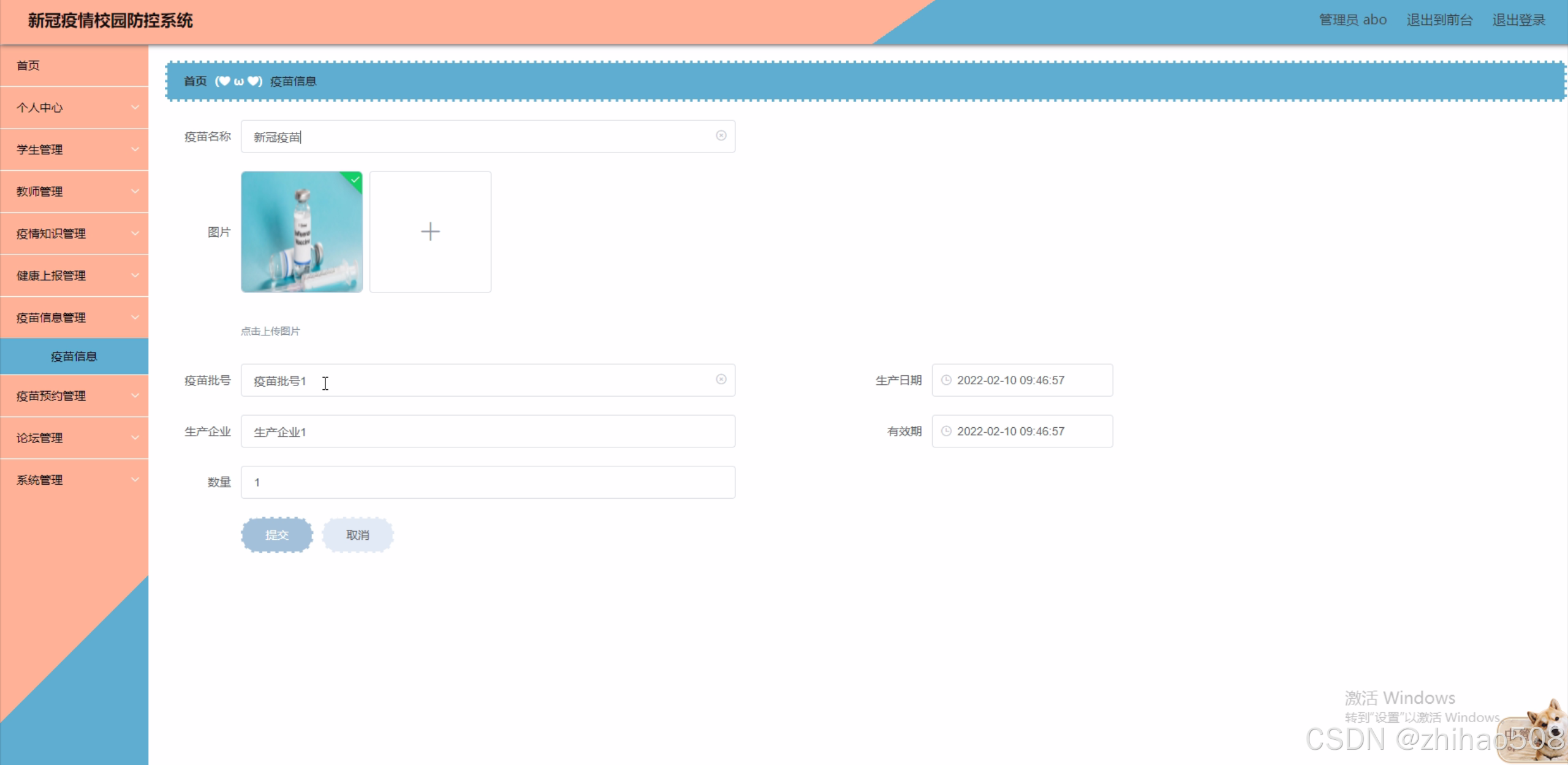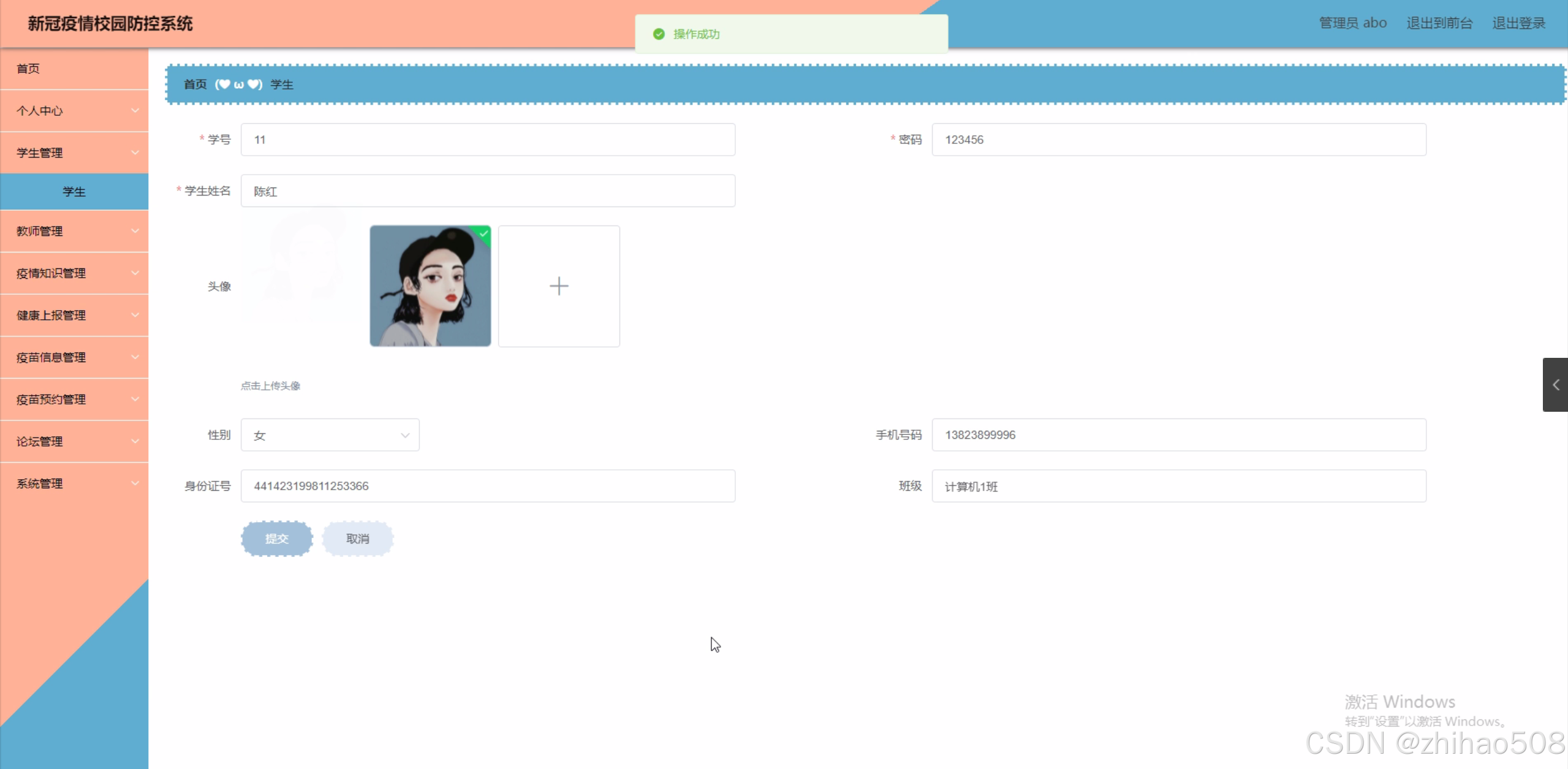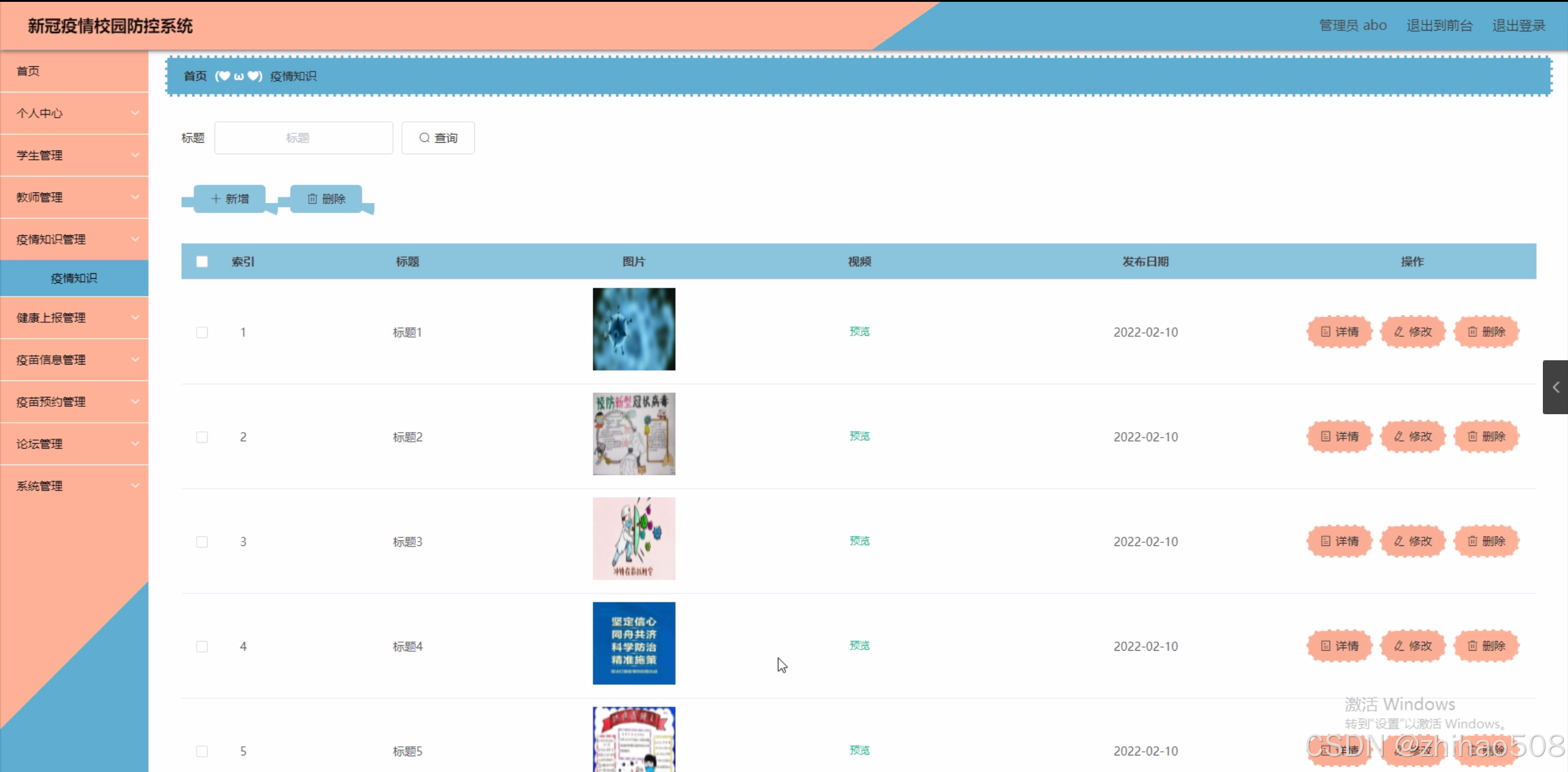 新冠疫情校园防控系统主要包括学生管理、教师管理、疫情知识宣传、健康上报、在线沟通、疫苗信息和疫苗预约等系统功能。学生管理模块用于记录学生的基本信息和健康状况;教师管理模块用于管理教师的信息和教学任务;疫情知识宣传模块用于发布最新的疫情信息和防控知识;健康上报模块允许师生定期上报自己的健康状况;在线沟通模块提供师生之间的即时通讯功能;疫苗信息和疫苗预约模块则用于发布疫苗接种信息和提供预约服务。通过这些功能模块的有机结合,可以构建一个全面、高效、智能化的新冠疫情校园防控系统。