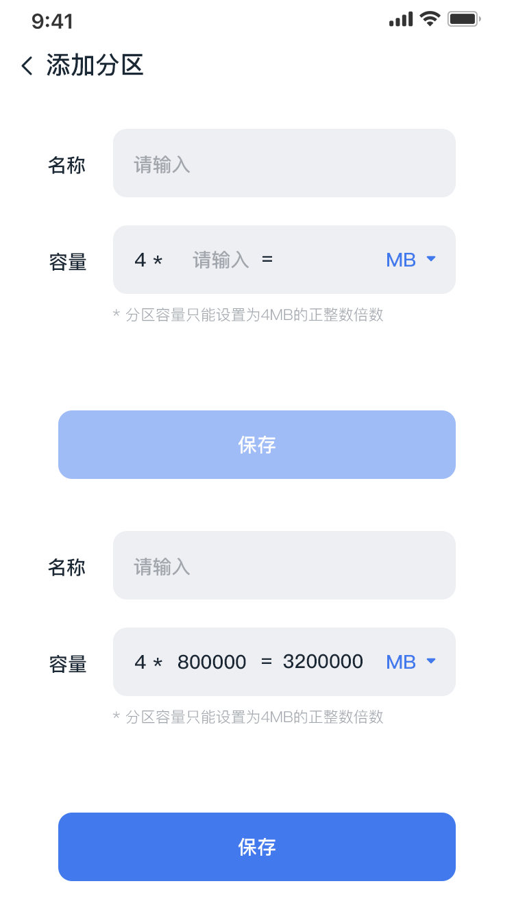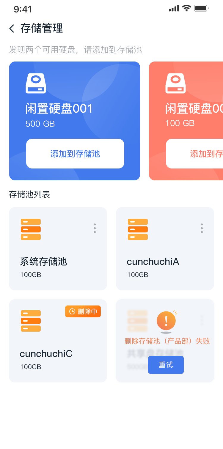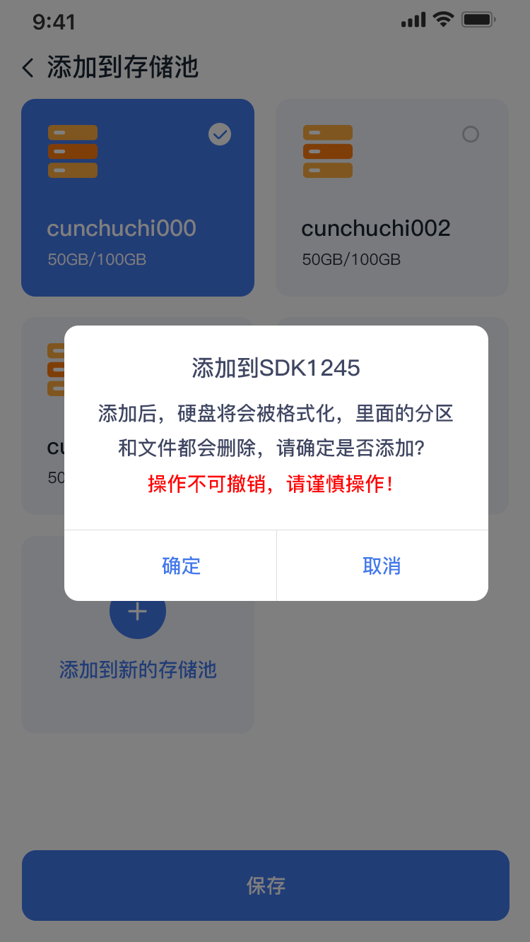 - 列表数据根据服务器获取,顶部数据为SA的外接硬盘数据,下部分则为云端创建的存储池数据。