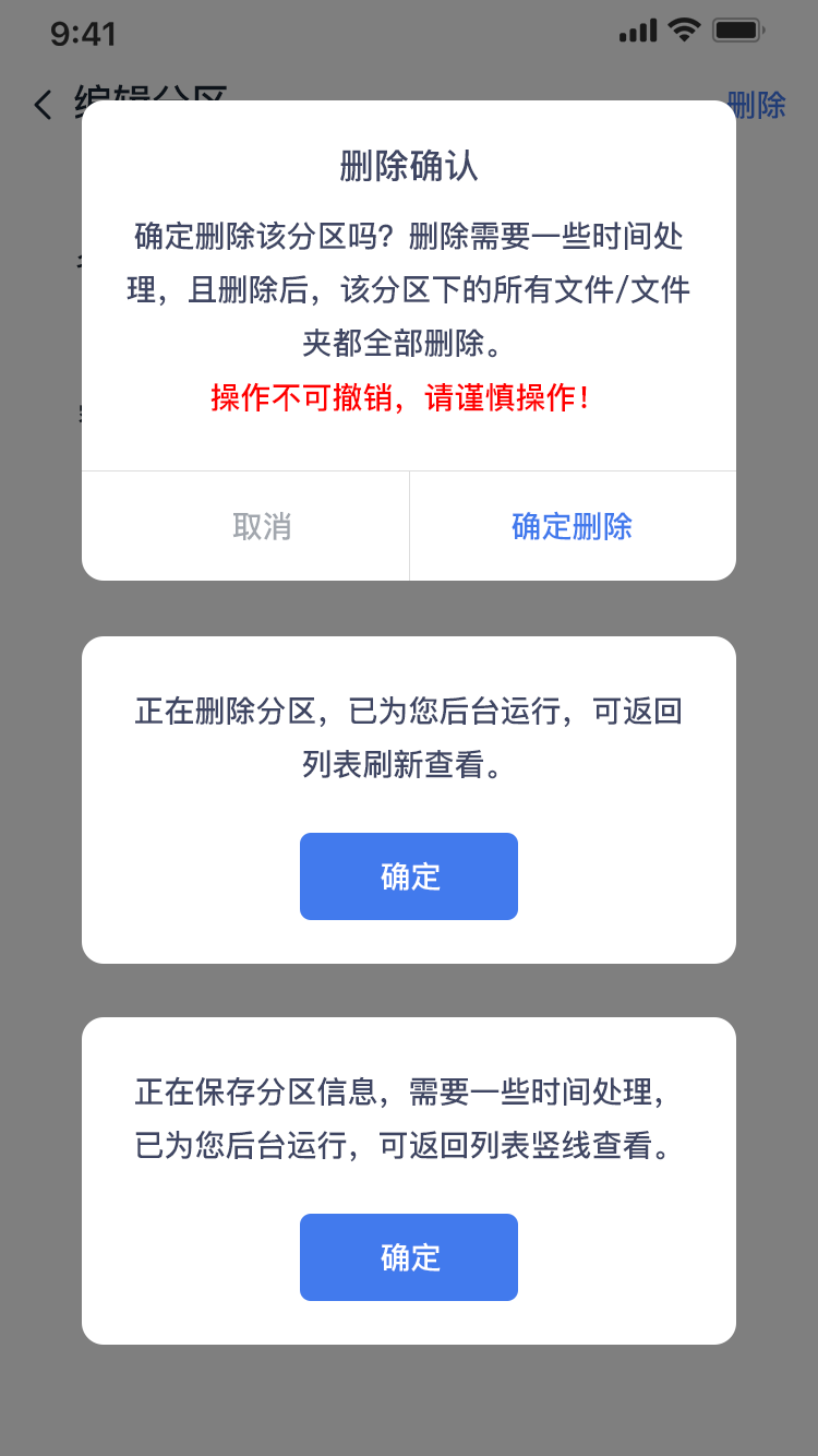 showText = "正在保存分区信息,需要一些时间处理,已为您后台运行,可返回列表刷新查看。"
