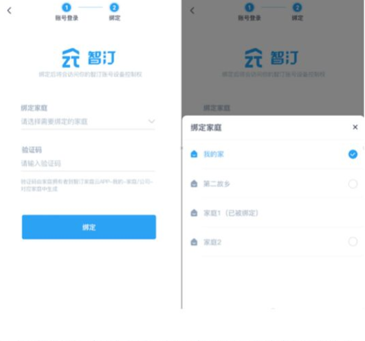 ④ 选择需要绑定智慧生活的家庭,输入验证码完成绑定。