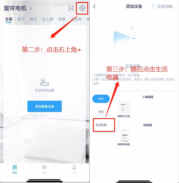 2. 其次,在家居首页右上角添加设备,随后在添加设备页中点击【生活电器】