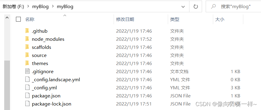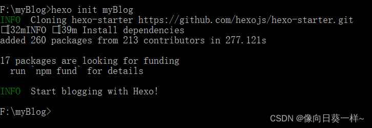安装 Hexo 完成后,请执行下列命令,Hexo 将会在指定文件夹中新建所需要的文件。