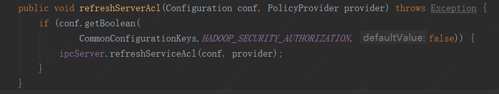 注:保证 hadoop.security.authorization = true hadoop.security.authentication = kerberos。调用 RPC.SERVER 的 refreshServiceAcl 接口即可。refreshServiceAcl 中 conf 参数为 hadoop conf ,provider 是:new HDFSPolicyProvider()。