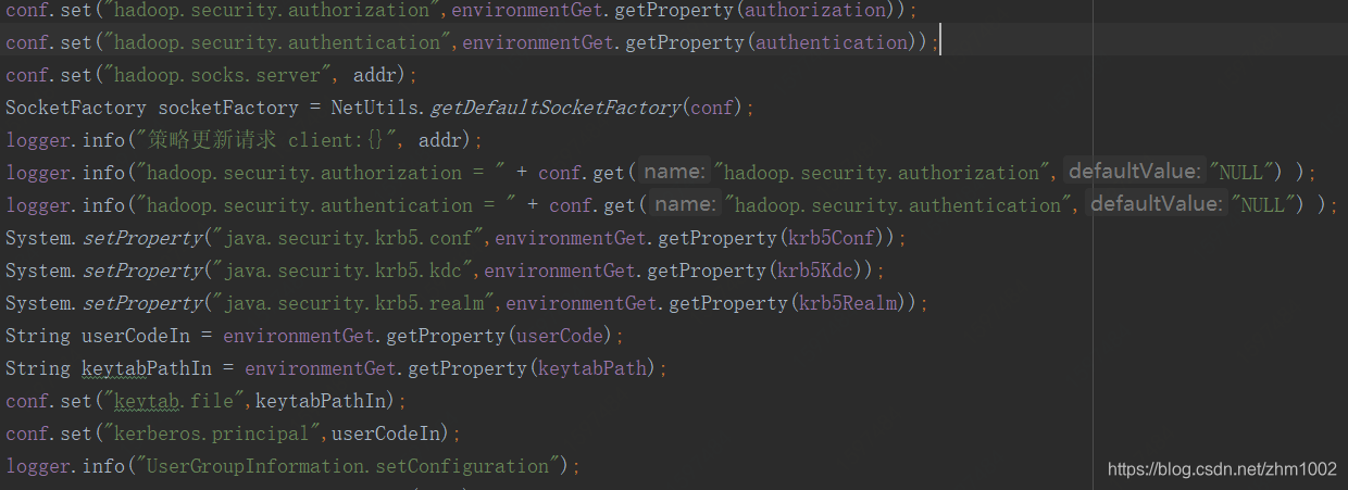 所以,在服务启动时可以使用NN的kerberos 认证信息进行认证。在启动服务前,通过HADOOP 的配置文件获取到 principal 和 keyTabPath 并将 principal 的值赋于 CommonConfigurationKeys.HADOOP_SECURITY_SERVICE_USER_NAME_KEY 这个配置参数。