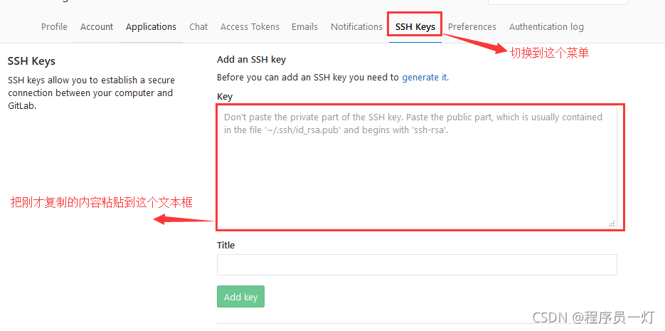 本文详细介绍了如何在Linux环境中生成SSH密钥对,并将公钥添加到GitLab以实现安全的身份验证。步骤包括使用ssh-keygen命令创建RSA密钥,不设置密码,查看并复制公钥内容,最后在GitLab个人设置的SSH Keys部分粘贴公钥,完成配置。