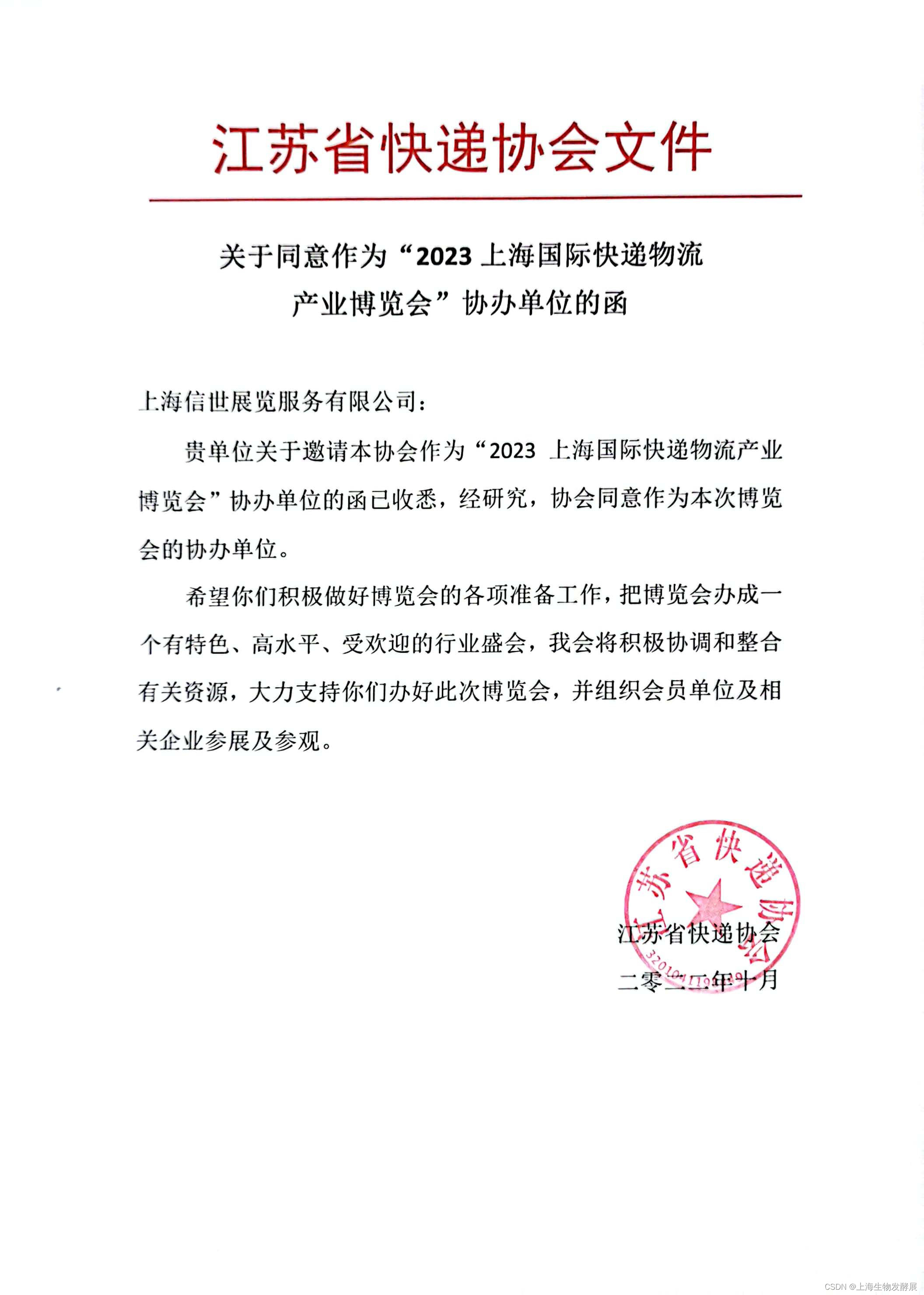 江苏省快递协会关于同意作为“2023上海国际快递物流产业博览会”协办单位的通知函