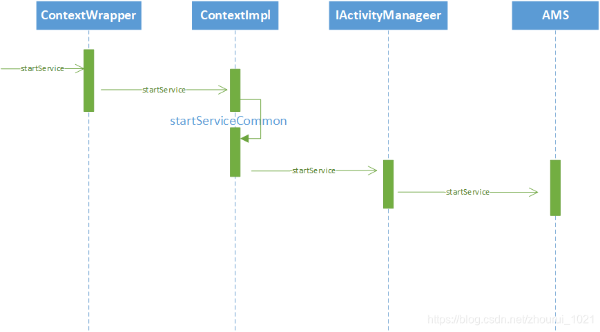 该方法中出现了我们熟悉的ActivityManager.getService().startService(....);代码,熟悉Activity启动过程的应该知道,其实这句代码就会调用到ActivityManagerService中的startService方法。至此,ContextImpl到AMS的调用过程就结束了。其时序图如下:
