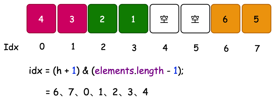 head计算为(0 - 1) & 7 = 7,并将5放入elements[7]。