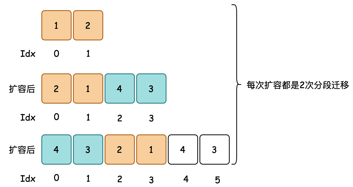 head位置(不包含第一次已经复制的部分)的元素,复制到新数组中紧挨着第一次复制元素的后面。继续上面的例子,原数组剩下的元素是[1, 2],现在把它们复制到新数组[3, 4]的后面,新数组就变成[3, 4, 1, 2]。这样就完整地把原循环数组中的所有元素,按照它们在循环数组中的顺序,复制到了新的扩容数组中。