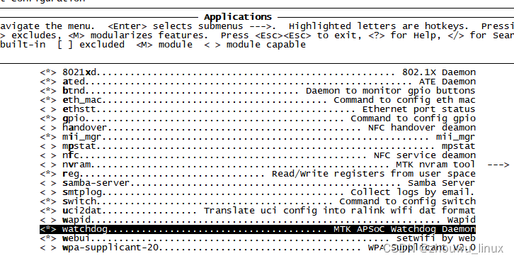 1.添加watchdog命令,运行 make menuconfig命令如下图所示: