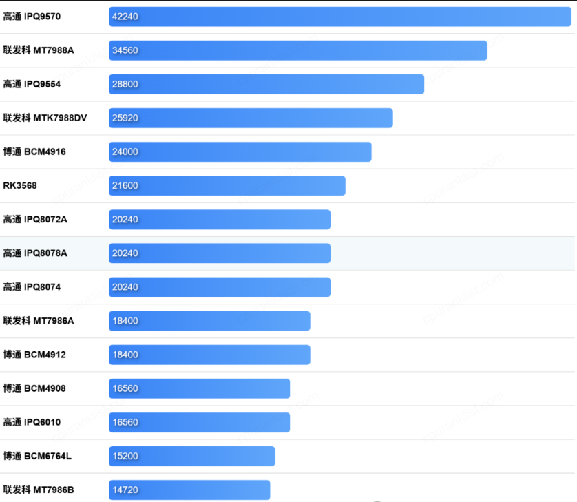 当然,在路由器领域,有平台专门整理了路由器CPU的性能天梯图,也是基于DMIPS算力的,比如: