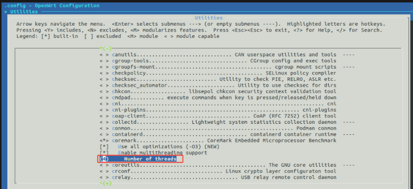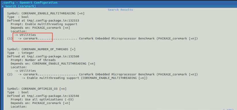 CoreMark是一套简化的CPU单核性能测试工具。在OpenWrt中默认支持CoreMark软件包,可以执行make menuconfig命令,在弹出的菜单中搜索coremark: