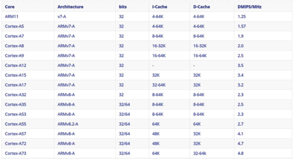 这里的DMIPS/MHz数据我们可以自己写程序计算,不过像ARM这种厂商,一般都提供了不同内核的测试结果数据,例如: