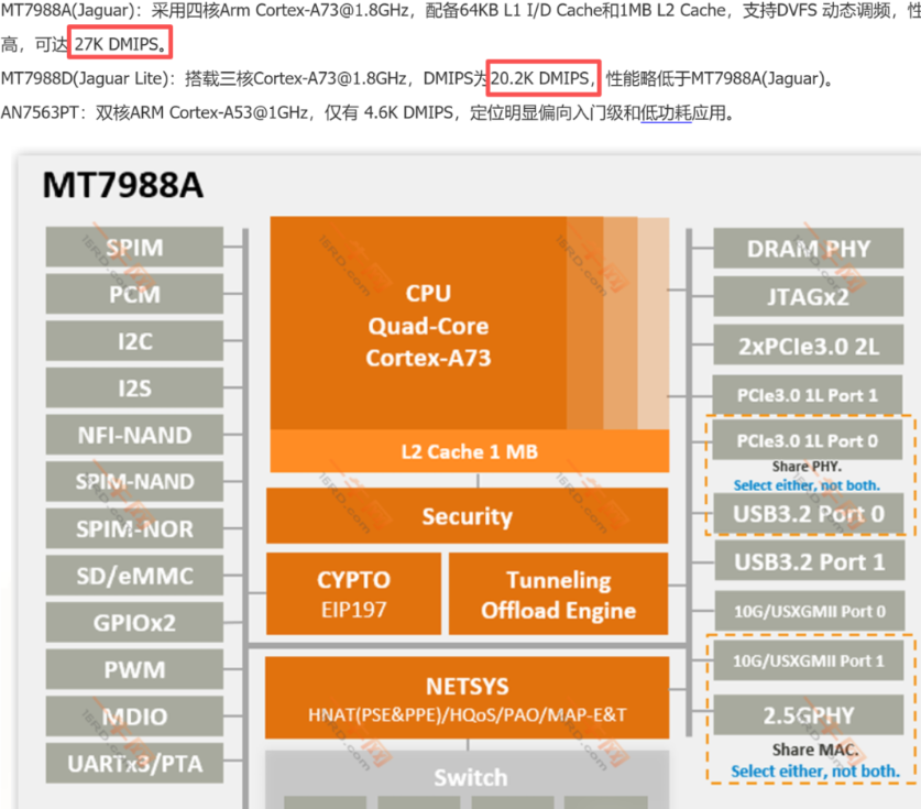 MT7988A:Quad-Core CA73@1.8GHz, 64-bit, 27K DMIPS