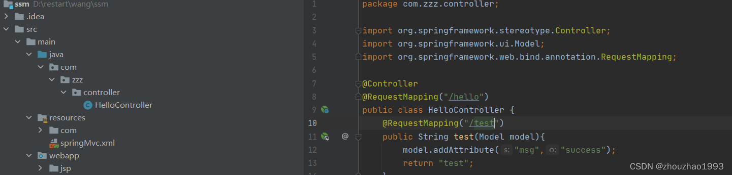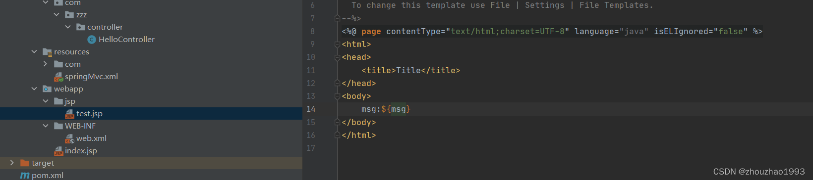 配置完以后,在java文件下创建com.zzz.controller.Hello控制层类,用来调试,在webApp目录下创建modul/test.jsp文件,示例如下: