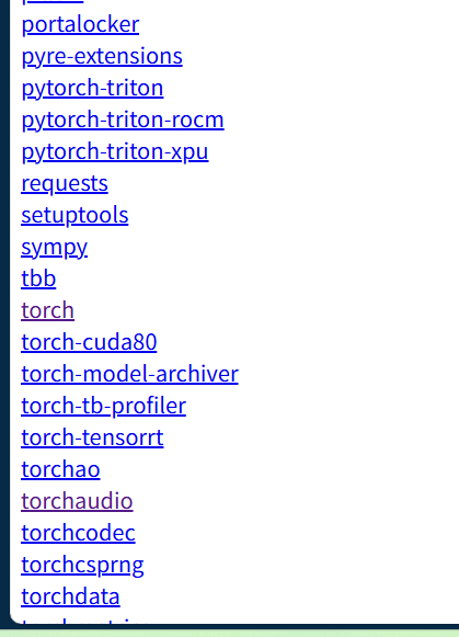 在页面中找到torch, torchvision, torchaudio; 点击进入。