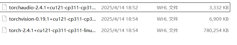e.g. torch-2.4.1+cu121-cp311-cp311-linux_x86_64.whl 表示 torch版本2.4.1, cu版本12.1, python版本3.11