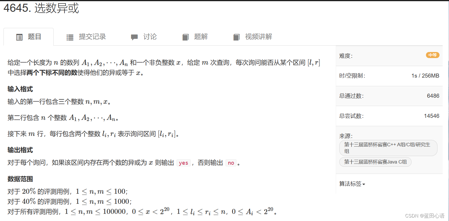 思路: 首先我们定义一个数组g[N], 其中的每个元素g[i] 表示在所有 i<j<=n 的j中,满足a[j] ^ a[i] = x的最小的那个j. 这是因为如果存在多个这样的j, 最小的那个j一定是最优的,因为他更加容易被包含在一个区间[l,r] 中.