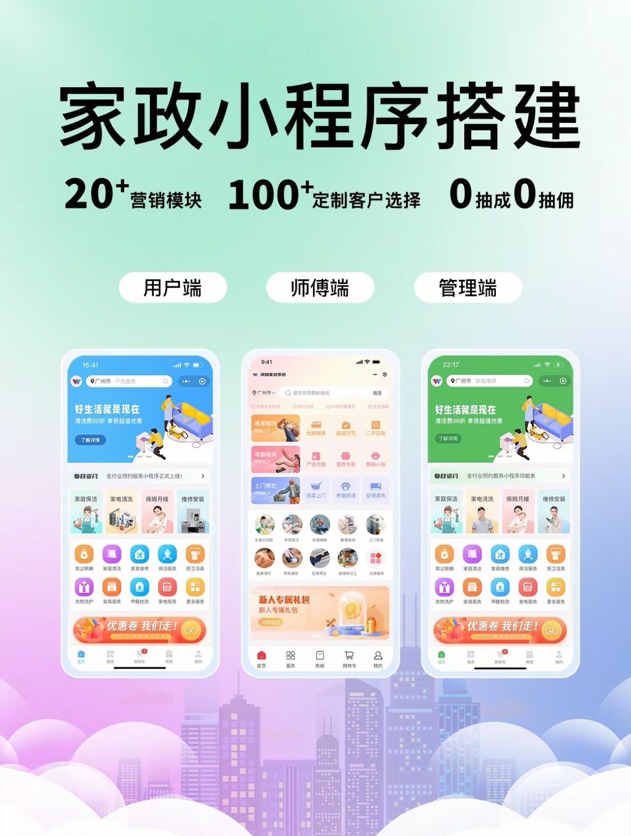 搭建含用户端、师傅端、管理后台的家政系统,覆盖保洁、维修、月嫂、保姆等服务预约,同步集成多元营销功能。