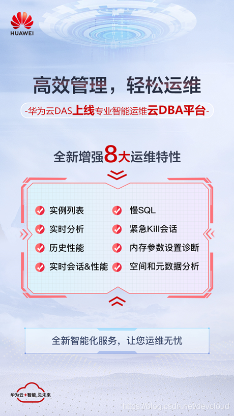 华为云数据管理服务DAS跟紧时代的步伐,针对运维急需解决的痛点,推出了云DBA运维平台,提供了 8大运维功能,为用户提供更加智能化、自助化、专业化运维服务。