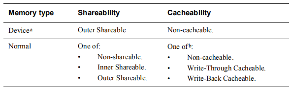 上表中Shareability是与一致性有关的内存属性,用来指示一个内存位置对于一些处理器是否是可共享的。共享意味着需要硬件保证一个内存位置中的内容对一定范围内可访问该位置的多个处理器是一致。Shareability属性有Non-shareable、InnerShareable和Outer Shareable三个选项,其含义为: