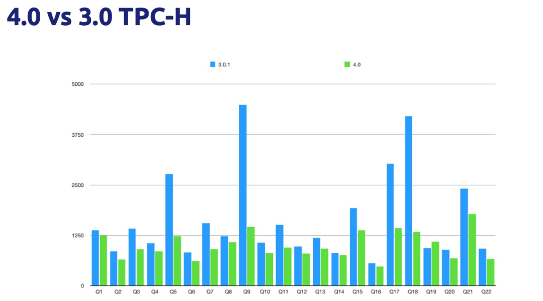 在演讲中,姚维也为我们展示了 TiDB 4.0 版本性能优化的部分成果(图中的纵轴是指语句耗时,该值越低代表性能越好):