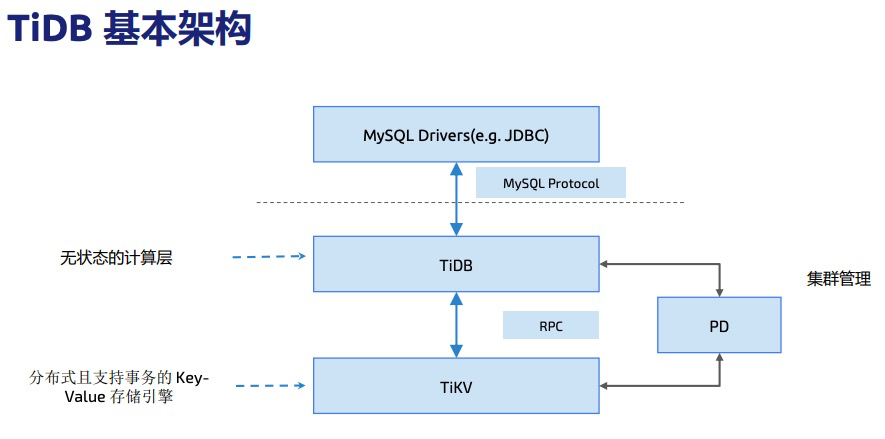 参考 Google Spanner / F1 的设计,TiDB 整体架构分为上下两层:负责计算的 TiDB Server 和 负责存储的 TiKV Server,二者由集群管理模块 PD Server 调度和管理。