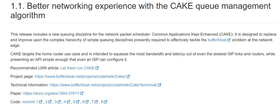 从上图可以看出,特性介绍的内容包含了一个对于该特性的简介、对于CAKE的介绍文献(包括一篇已发表的论文)和补丁文件的代码(Code项)。如果读者不清楚bufferbloat的含义,可以点击蓝色的bufferbloat关键字,于是我们了解到:bufferbloat是指由于路由器或其他网络设备缓存了过多的数据,从而产生了用户不期望的延迟。为解决这一问题,CAKE和它之前的解决方案主要是从队列管理入手的,这些方案被广泛用于数百万台计算机上,并将瓶颈链路上由于竞争导致的延迟降低到了20ms的量级(由此我们可以看出,被广泛应用的开源项目中所蕴含的创新力量)。
