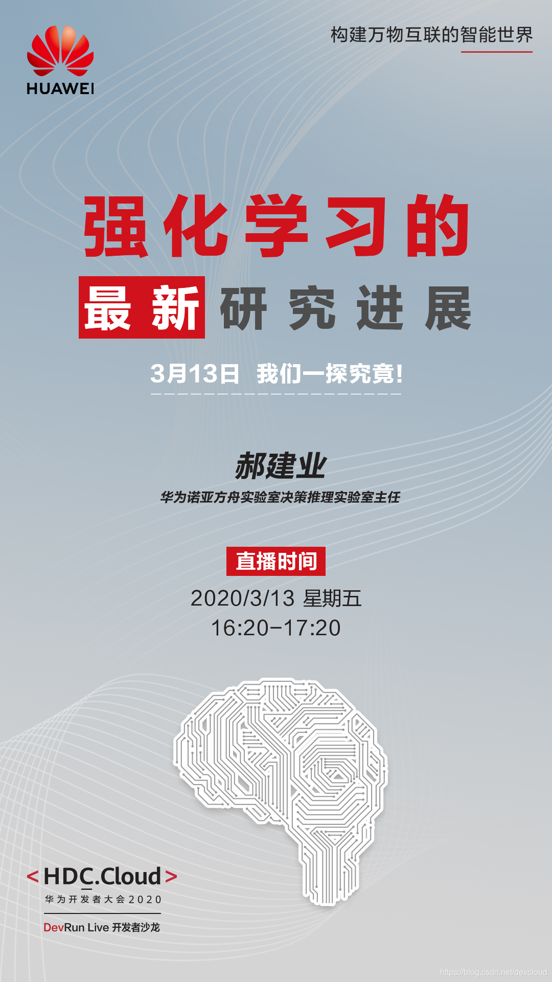3月13日下午14:00-17:20举行的华为开发者大会2020(Cloud)第三期华为DevRun Live开发者沙龙中,华为诺亚方舟实验室决策推理实验室主任郝建业将分享《强化学习的落地实践》,围绕强化学习的发展历史,介绍强化学习背景,强化学习的最新研究进展,以及强化学习在业界的落地实践,并介绍该领域面临的挑战性问题和未来发展方向。