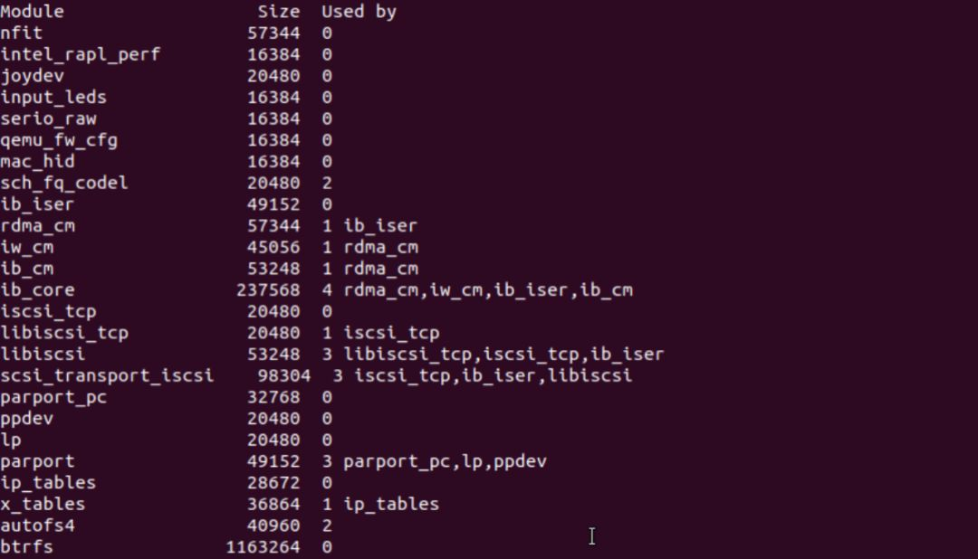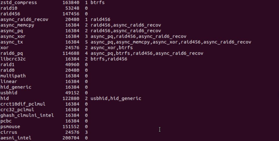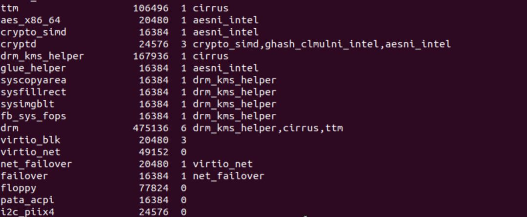 为了查看模块之间的依赖关系,我们可以使用lsmod命令,该命令展示了内核已装载模块的模块列表和各个模块所依赖的模块。如果读者已经按照“Linux内核编程环境”小节中所介绍的方法安装了Linux 4.19.94版的内核,那么使用lsmod命令会出现如下列表: