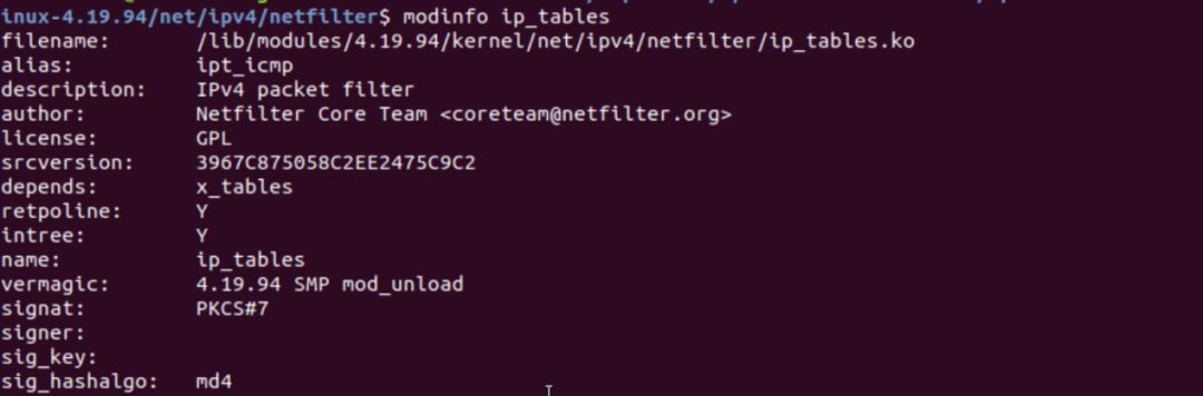 除了用lsmod命令可以看到模块之间的依赖关系外,查看modules.dep文件也可以看到,该文件的路径为/lib/modules/4.19.94/modules.dep,打开后搜索ip_tables可以看到如下信息: