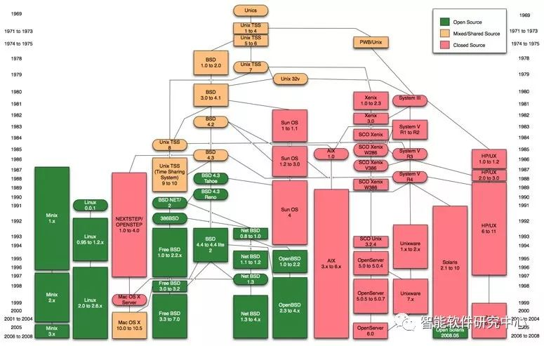 其实,除了之前提到的Minix系统外,Linux系统本身也站在巨人的肩膀上,在它发布之前操作系统就已经经过了长期的发展,下表展现了Linux更深的渊源[7]: