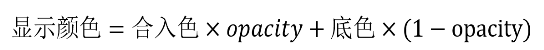 opacity单词意思为透明度,直观视觉效果就是颜色变淡了,但最终显示的颜色其实仍然可以用RGB三个通道来表示,从数值运算的角度来看,它实际上表示了它采用一般混合策略和其他颜色进行混合时的比例,也就是: