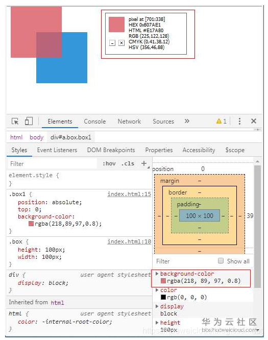 例如在网页默认的白底色上rgba(255,255,255)显示一个包含透明度的rgba(218,89,97,0.8)颜色, 那么颜色的RGB分量都按照上述公式进行计算就得到rgb(225,122,128),用取色器拾取一下渲染出来的点,结果和上述理论是一致的: