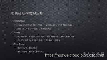 架构师如果想要关注质量,想要把质量管好的话,他必须深度参与codereview,通过代码评审来把好这个质量关,有很多研发团队,都会自己在公司里面搭一个gitlab,有些公司会直接把他的项目放在像我们华为软件开发云上,那么,我们软件开发就会支持一个基于Mergerequest的合并请求的codereview,架构师需要做codereview其实是在代码合入主干之前就去评审,这些代码是不是满足质量的要求。与此同时,通过代码评审,尤其是通过架构师对于代码的评论、意见和建议,来帮助整个团队的成员不断的提升技术能力,这样才能够把质量管起来,如果说这个代码已经合入进去了,编译测试都通过,甚至都已经上到生产环境了,这个时候再去看,代码质量好像不太好,这个时候就已经晚,防微杜渐最好是做在前面的,这就是codereview的重要性。