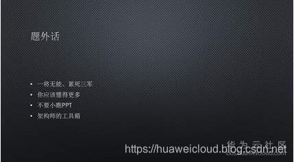 不要小瞧PPT。为什么要说这句话,其实,怎么说呢,因为我在某一个JavaEye老炮群里面,其实聊过这个话题,很多人做技术的人,尤其是技术比较钻研,对技术有追求的人,通常会瞧不起一种叫做PPT架构,真的有这样的架构师,他们最擅长的是写PPT,但是千万不要小瞧PPT,PPT是一种表达观点,说服他人贯彻执行用的工具,如果你的PPT写不好,通常你的表达能力会不够好,通常你的沟通能力也不够好,甚至很有可能你的逻辑思维能力都不够强,写一个好的PPT是非常重要,非常关键的能力,群发这样的能力很有可能在职业成长的过程中受阻。
