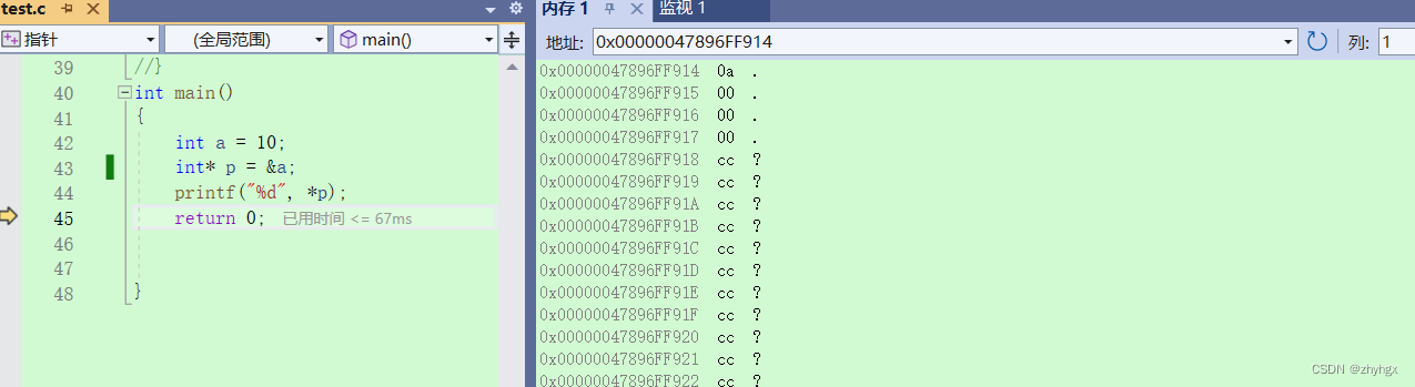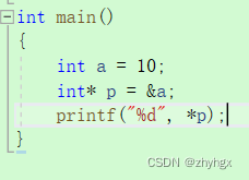 在下面的代码中,我们可以看到想要取得a的地址,就需要用到&操作符,取出a的地址放到指针变量去,这个时候,指针变量p就是放的a的地址,我们想要获取对应的值,就需要*解引用操作符。